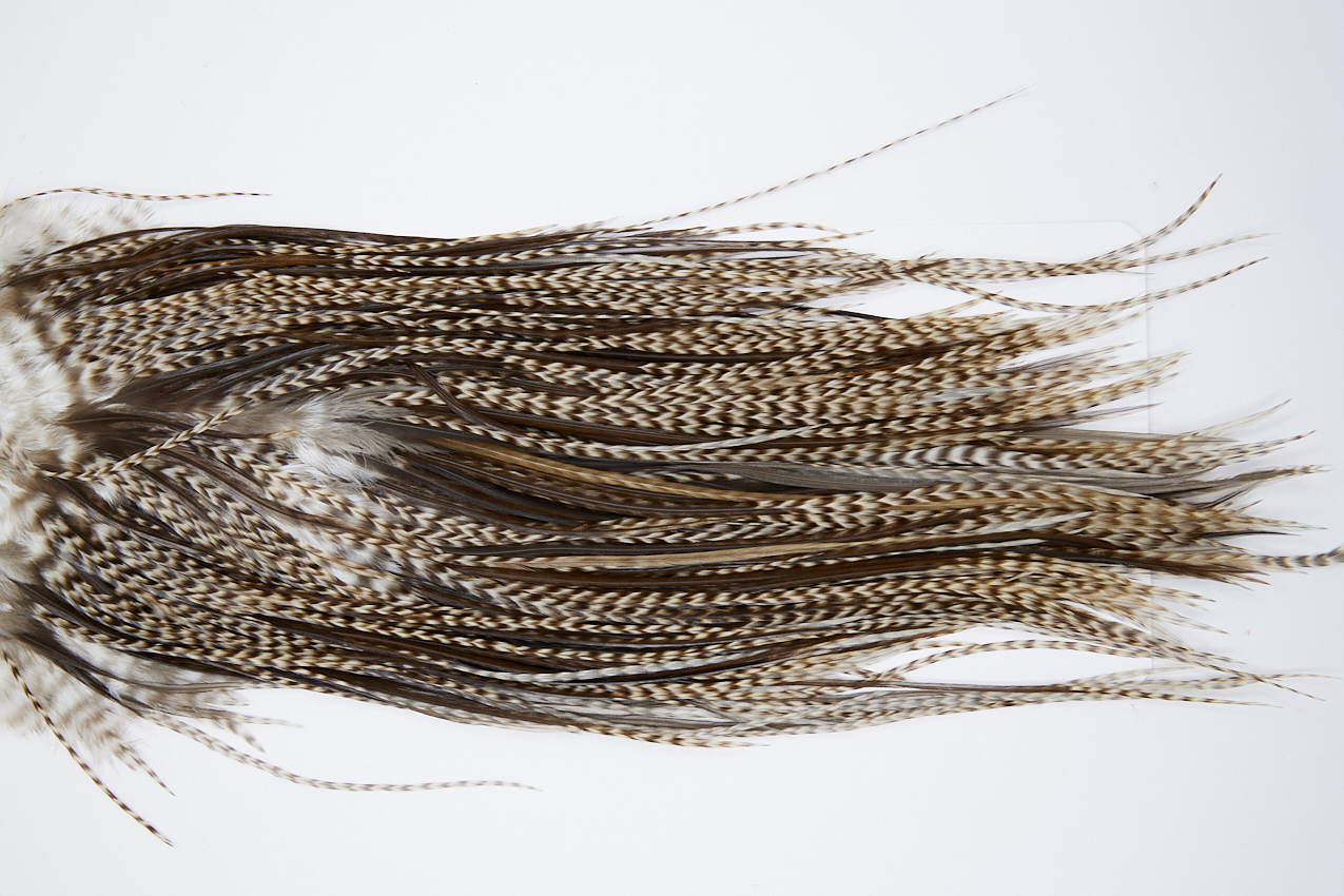 10166 is a Beaverkill Rooster Saddle of Dun Grizzly color that ties predominately size 12-14. The image shown is an actual photo of this dry fly saddle. This is NEW UNUSED HACKLE.