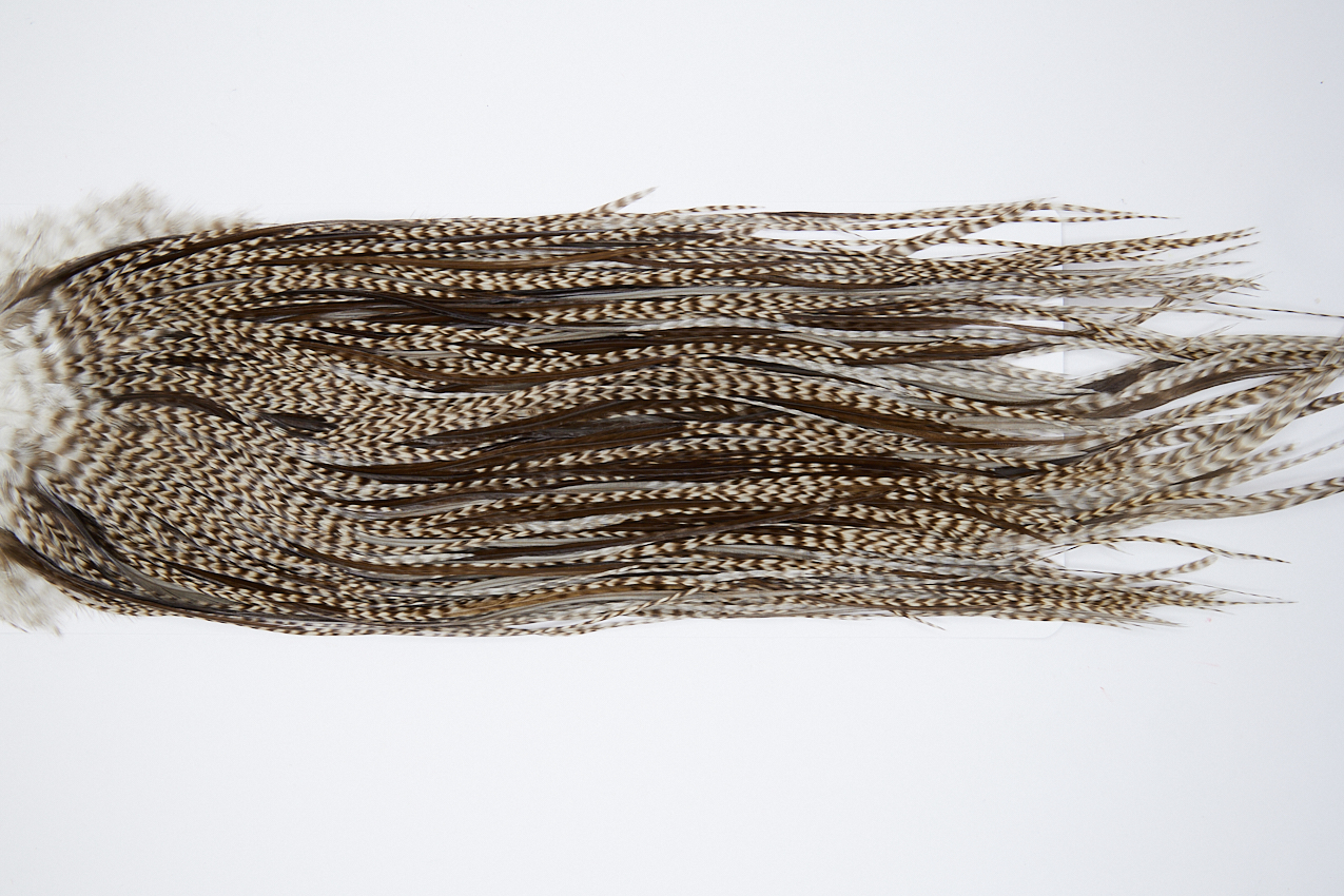 10170 is a Beaverkill Rooster Saddle of Dun Grizzly color that ties predominately size 12-14. The image shown is an actual photo of this dry fly saddle. This is NEW UNUSED HACKLE.