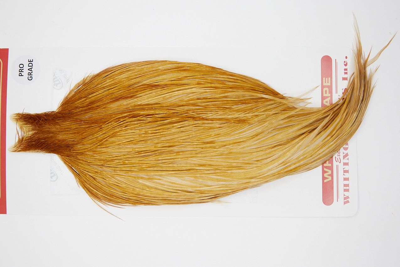 10204 Whiting Pro Grade Rooster Cape of Medium Ginger color that ties predominately size 10-22. The image shown is an actual photo of this dry fly cape. This is NEW UNUSED HACKLE.