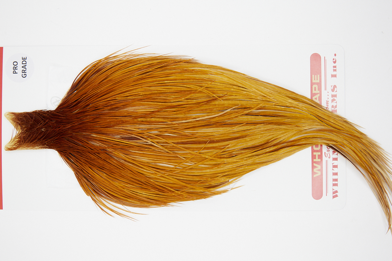 10205 Whiting Pro Grade Rooster Cape of Medium Ginger color that ties predominately size 10-20. The image shown is an actual photo of this dry fly cape. This is NEW UNUSED HACKLE.