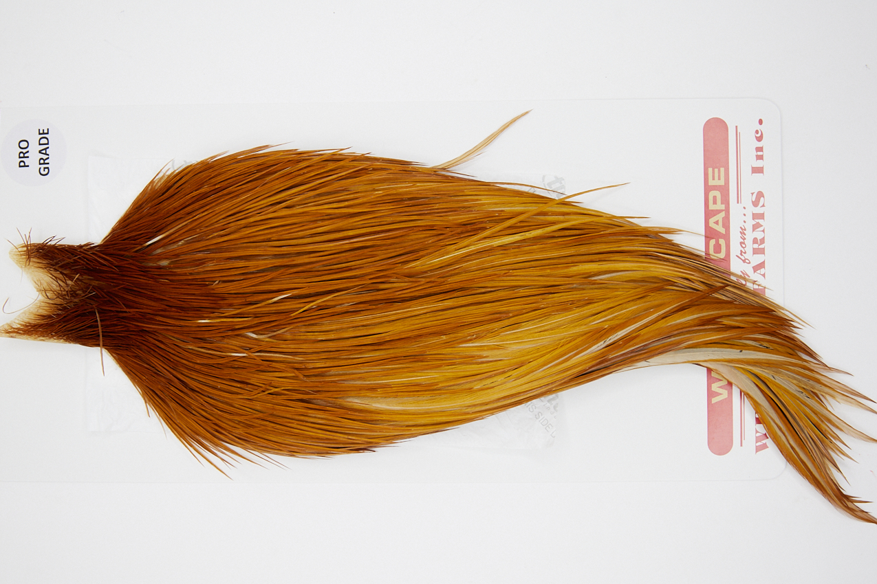10208 Whiting Pro Grade Rooster Cape of Medium Ginger color that ties predominately size 10-22. The image shown is an actual photo of this dry fly cape. This is NEW UNUSED HACKLE.