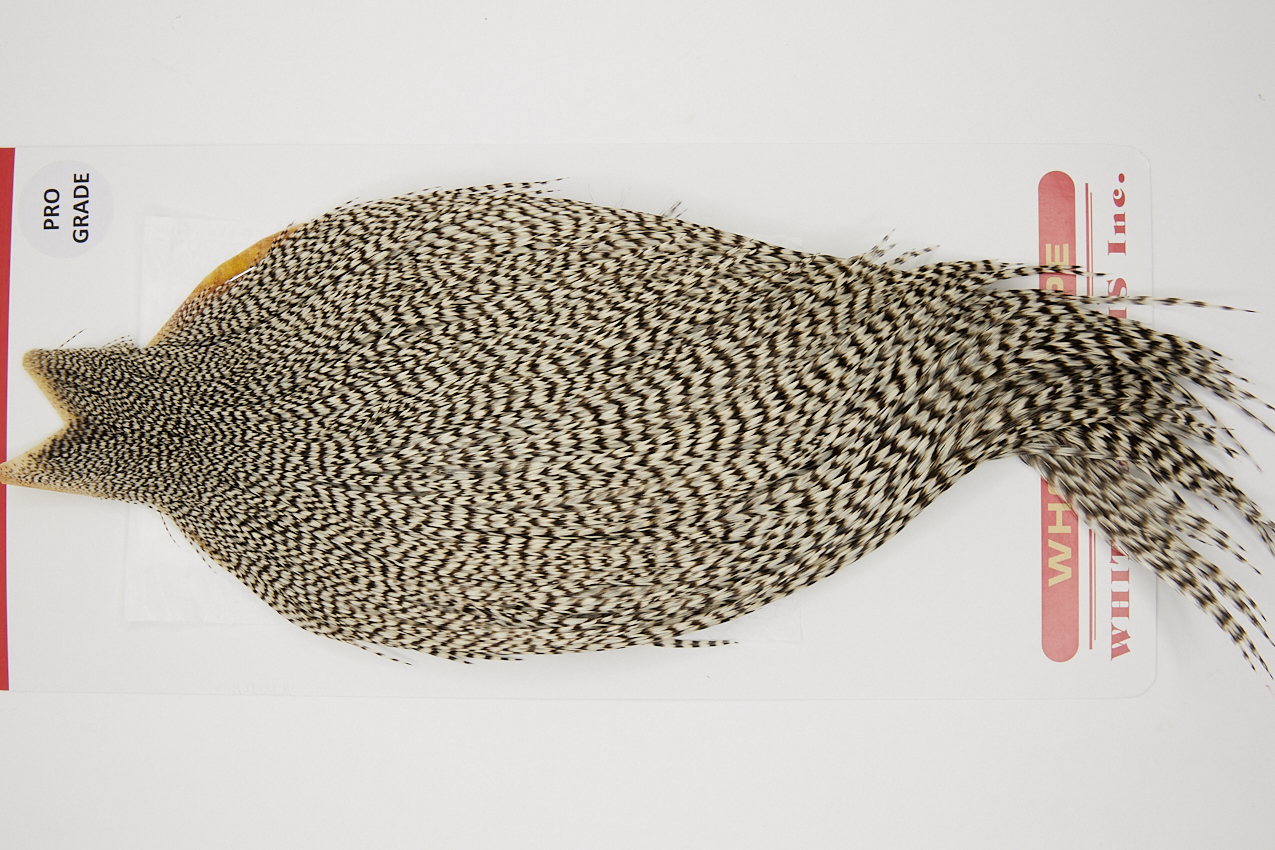 10216 Whiting Pro Grade Rooster Cape of Grizzly color that ties predominately size 10-20. The image shown is an actual photo of this dry fly cape. This is NEW UNUSED HACKLE.
