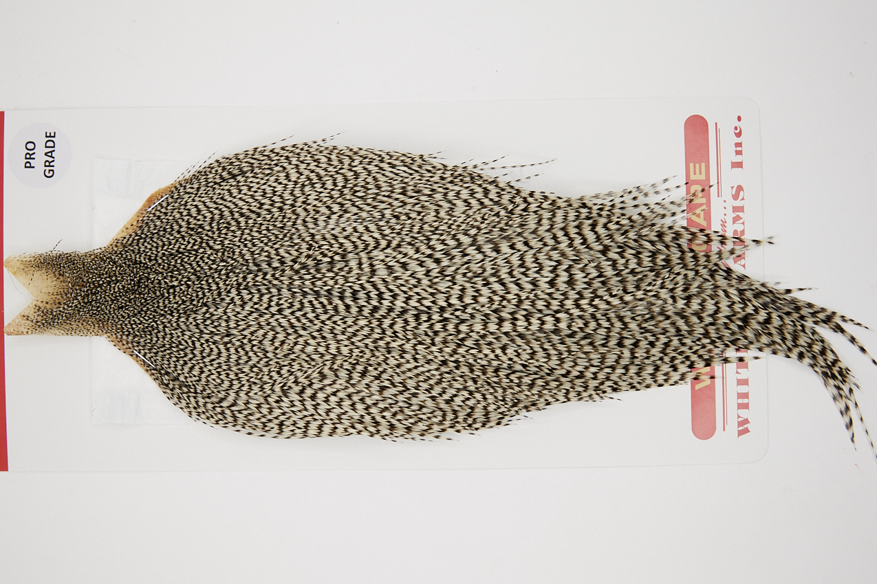 10222 Whiting Pro Grade Rooster Cape of Grizzly color that ties predominately size 8-20. The image shown is an actual photo of this dry fly cape. This is NEW UNUSED HACKLE.