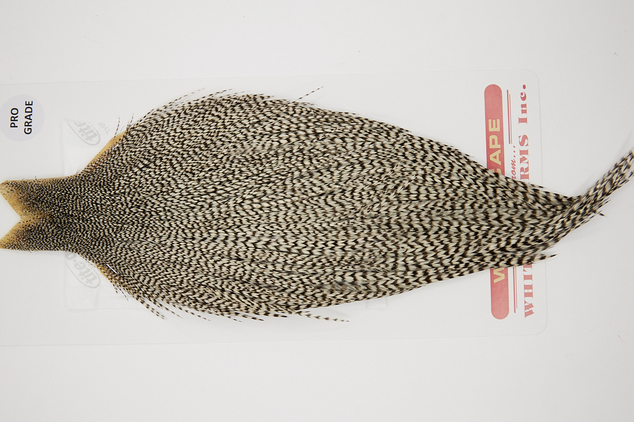 10223 Whiting Pro Grade Rooster Cape of Grizzly color that ties predominately size 10-20. The image shown is an actual photo of this dry fly cape. This is NEW UNUSED HACKLE.