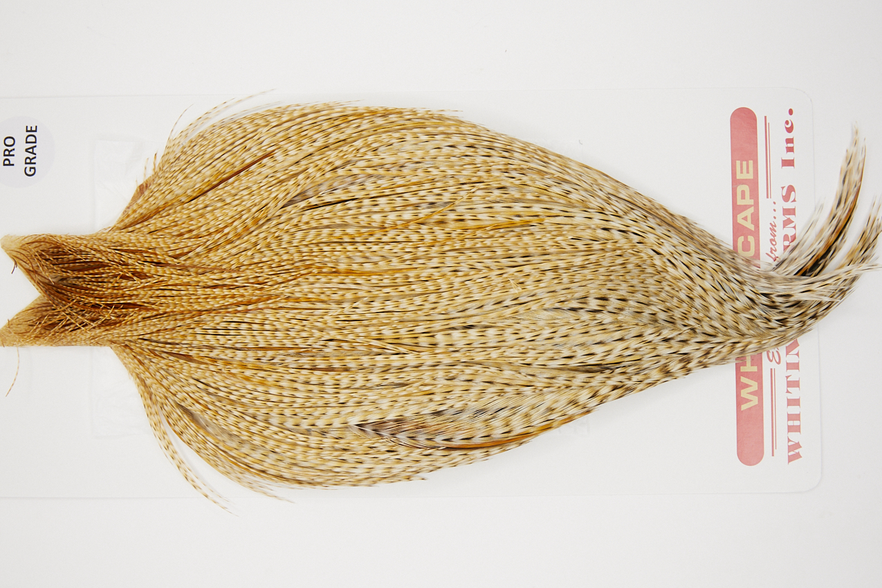 10225 Whiting Pro Grade Rooster Saddle of Barred Medium Ginger color that ties predominately size 8-22. The image shown is an actual photo of this dry fly saddle. This is NEW UNUSED HACKLE.
