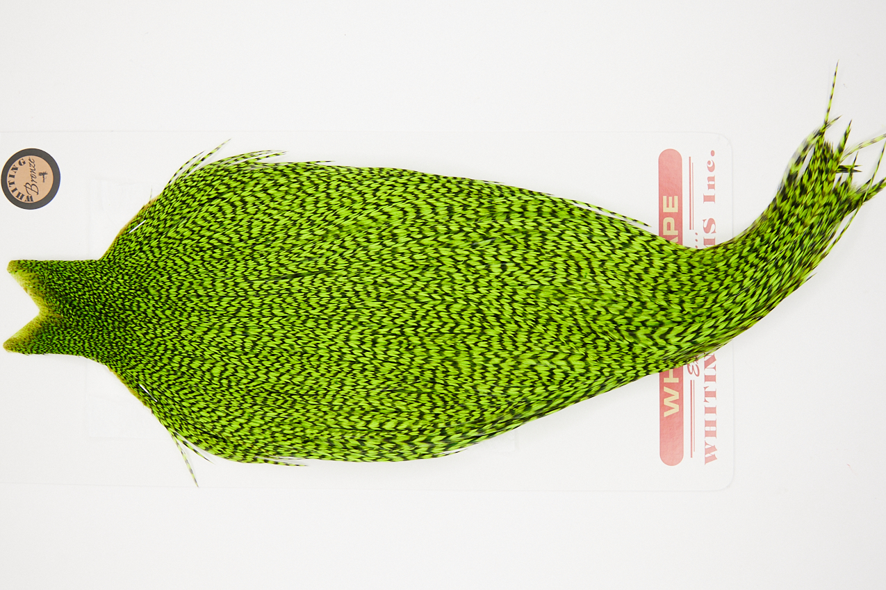 10246 Whiting Bronze Grade Rooster Cape of Grizzly Chartreuse color that ties predominately size 8-20. The image shown is an actual photo of this dry fly cape. This is NEW UNUSED HACKLE.