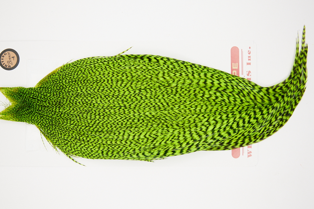 10248 Whiting Bronze Grade Rooster Cape of Grizzly Chartreuse color that ties predominately size 8-20. The image shown is an actual photo of this dry fly cape. This is NEW UNUSED HACKLE.