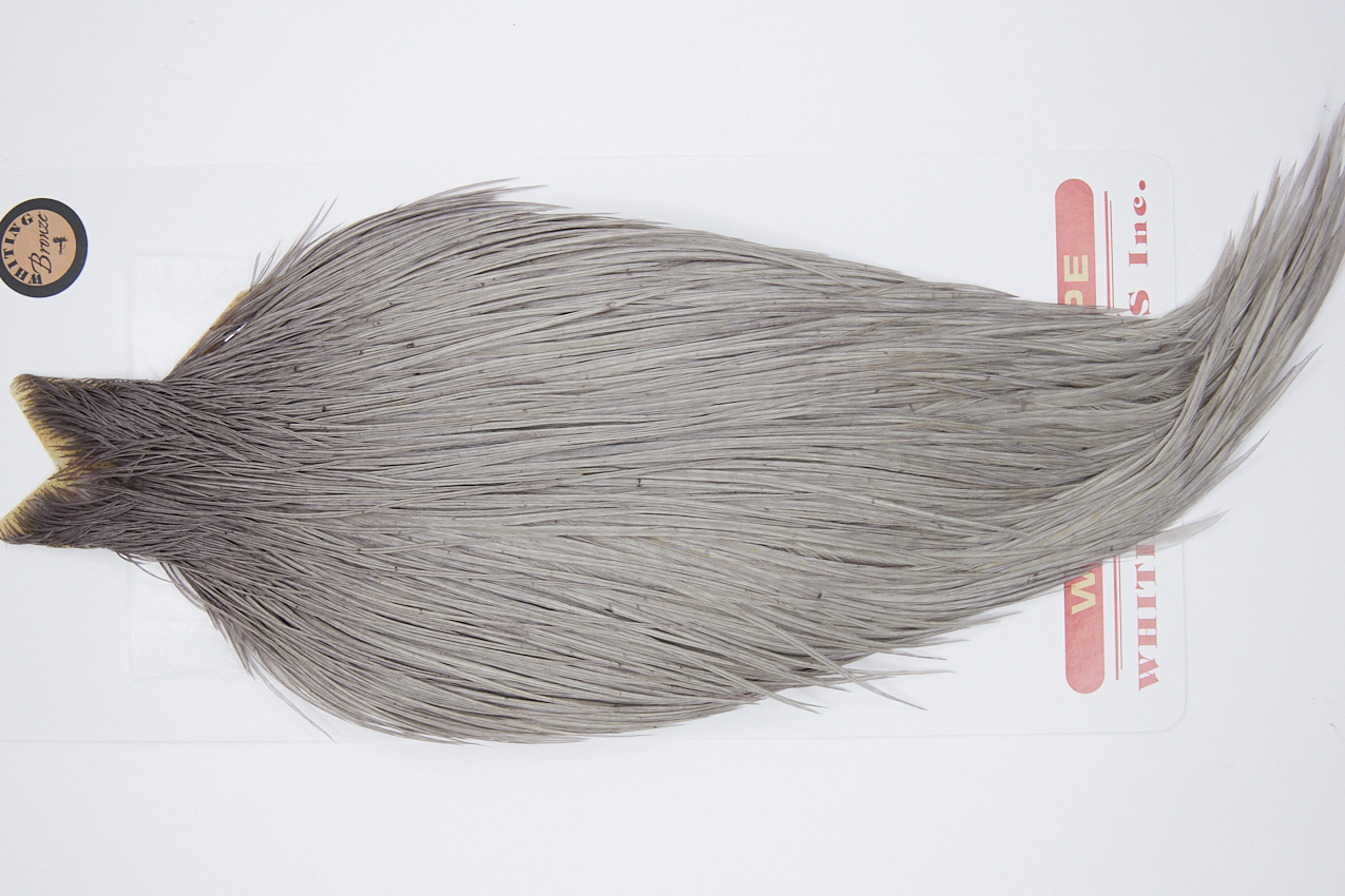 10255 Whiting Bronze Grade Rooster Cape of Medium Dun color that ties predominately size 8-20. The image shown is an actual photo of this dry fly cape. This is NEW UNUSED HACKLE.