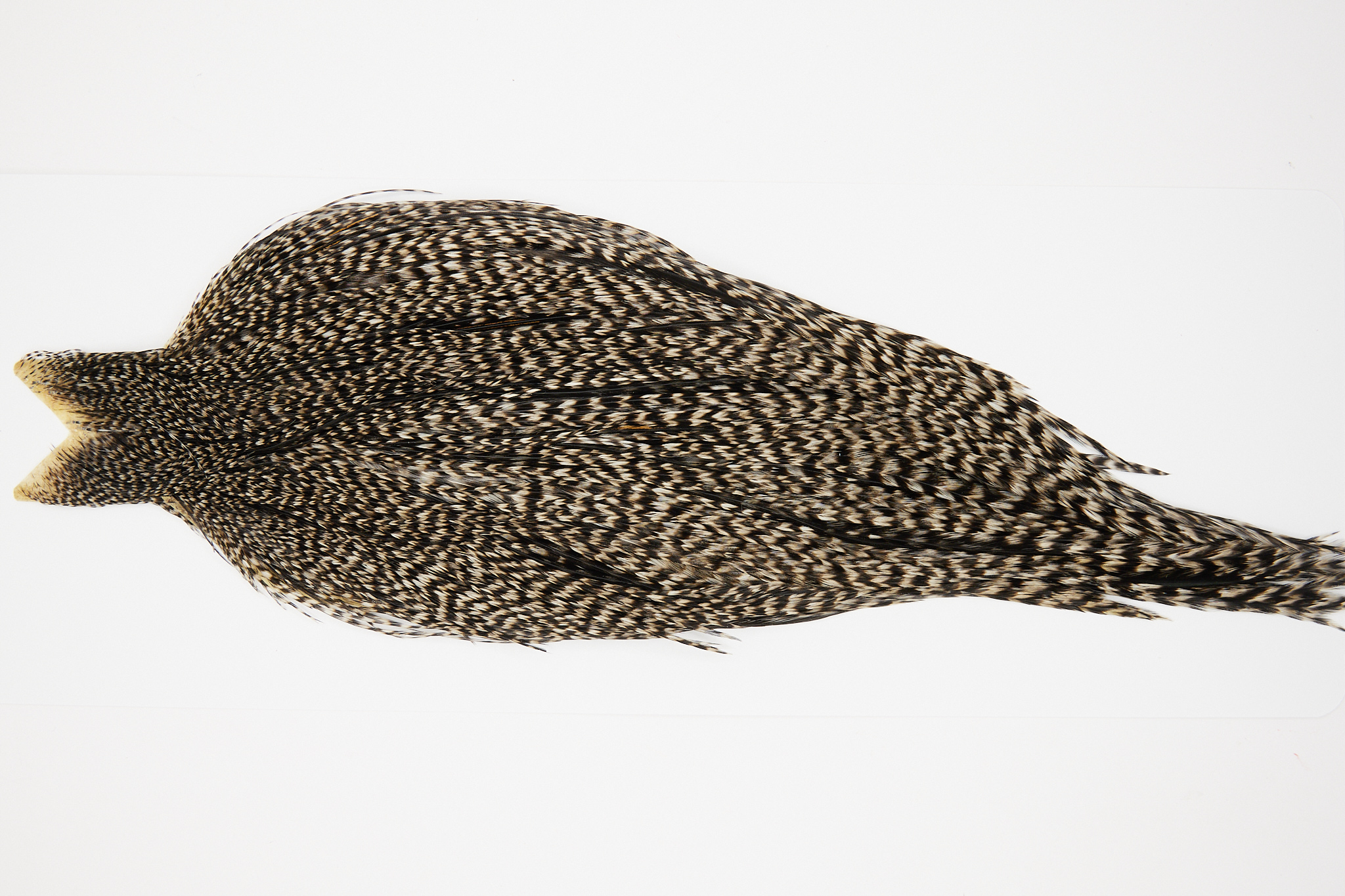 10318 is a JimsFlyCo Grade 2 Rooster Cape of Grizzly Variant color that ties predominately size 10-18. The image shown is an actual photo of this dry fly cape. This is NEW UNUSED HACKLE.