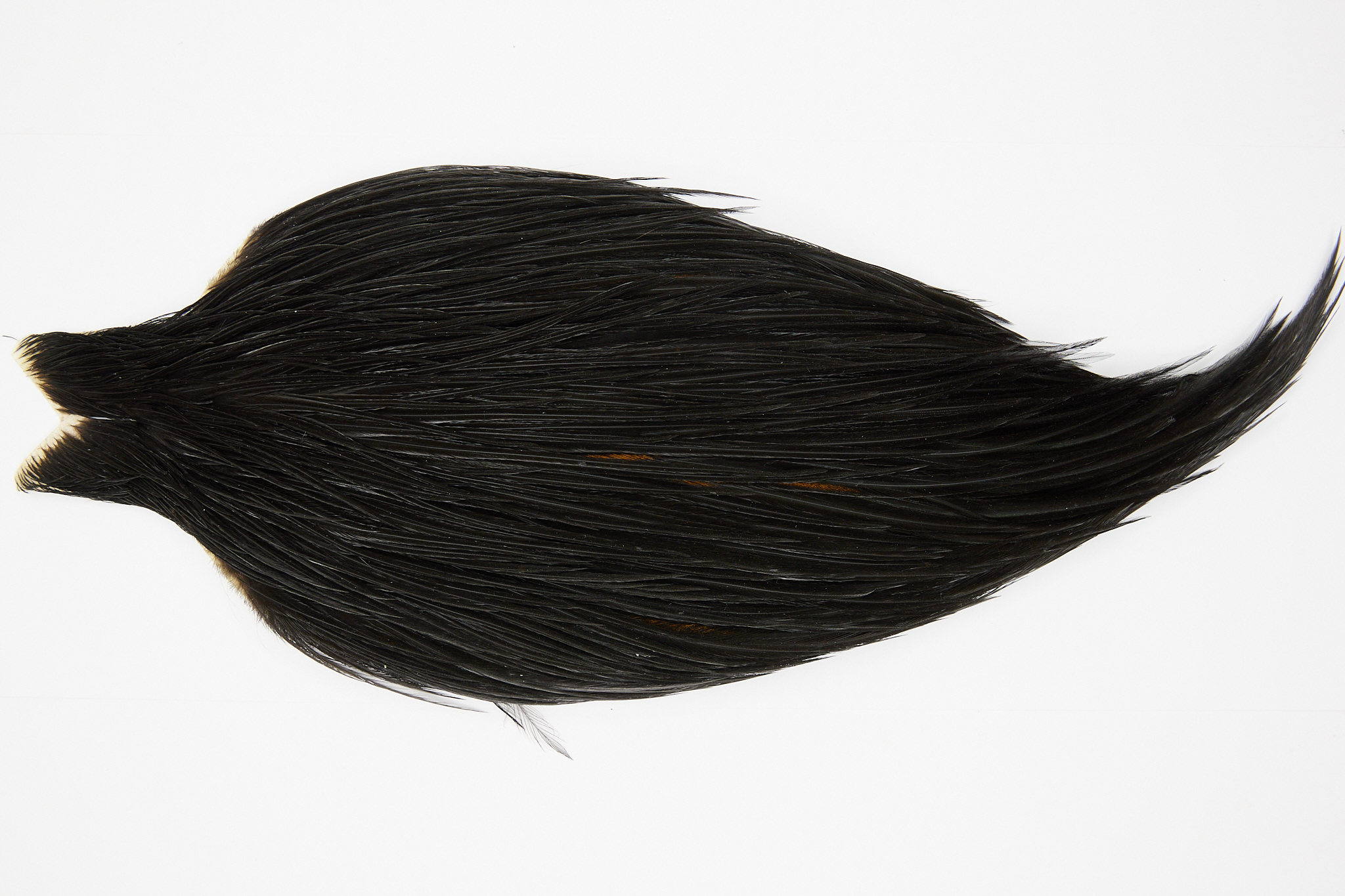10359 is a JimsFlyCo Grade 2 Rooster Cape of Black color that ties predominately size 12-18. The image shown is an actual photo of this dry fly cape. This is NEW UNUSED HACKLE.