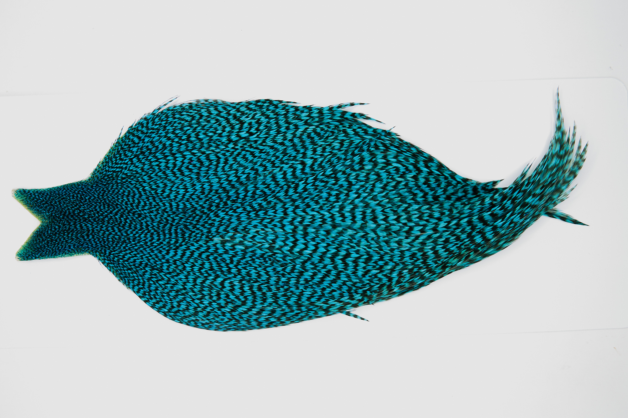 10401 is a JimsFlyCo Grade 2 Rooster Cape of Grizzly Kingfisher Blue color that ties predominately size 10-20. The image shown is an actual photo of this dry fly cape. This is NEW UNUSED HACKLE.