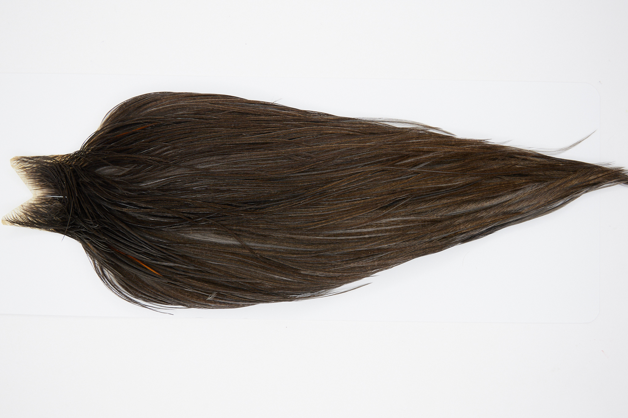 10470 is a JimsFlyCo Grade 1 Rooster Saddle of Dark Dun color that ties predominately size 8-22. The image shown is an actual photo of this dry fly saddle. This is NEW UNUSED HACKLE.