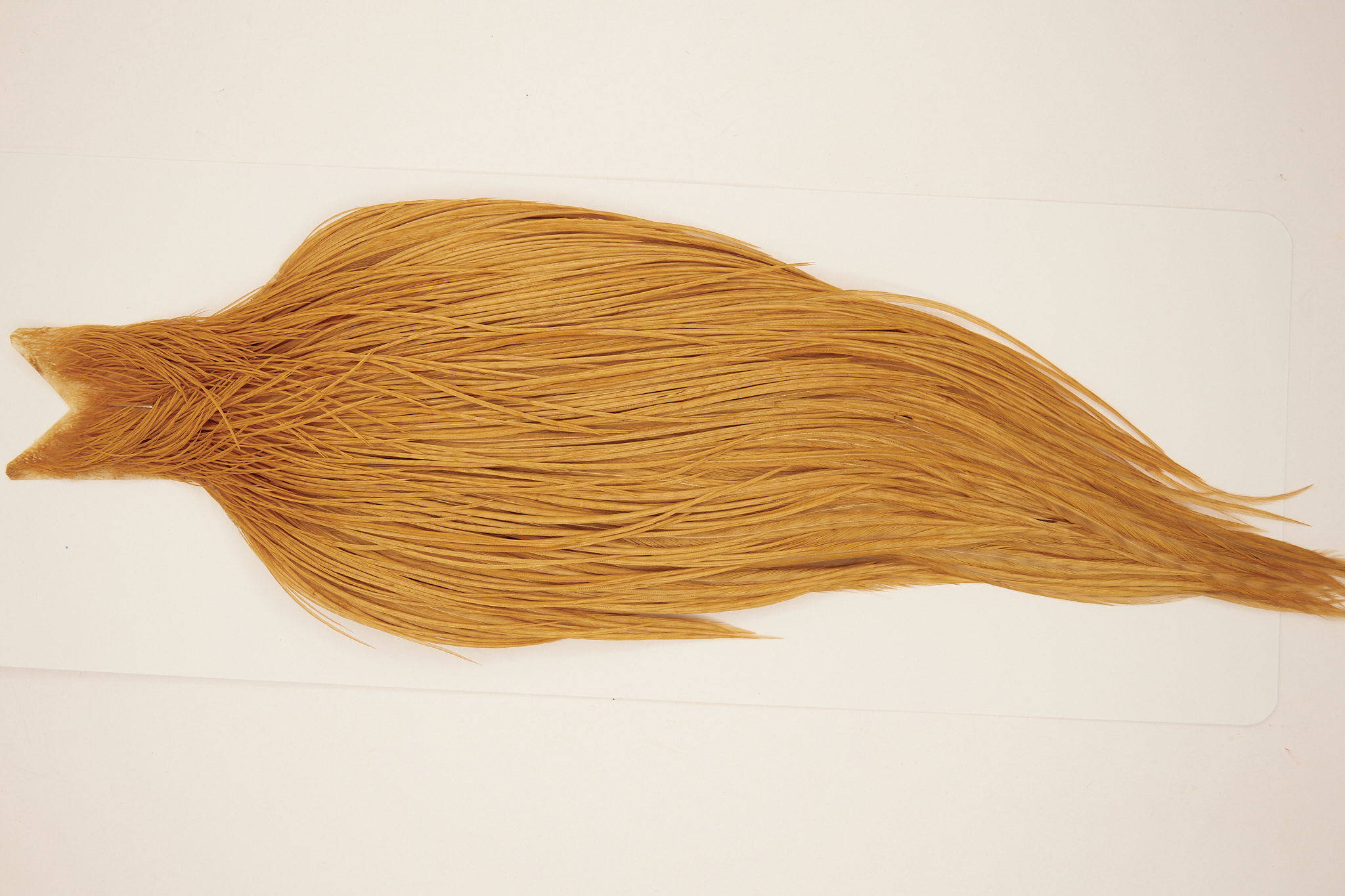 10475 is a JimsFlyCo Grade 1 Rooster Saddle of Ginger color that ties predominately size 10-20. The image shown is an actual photo of this dry fly saddle. This is NEW UNUSED HACKLE.