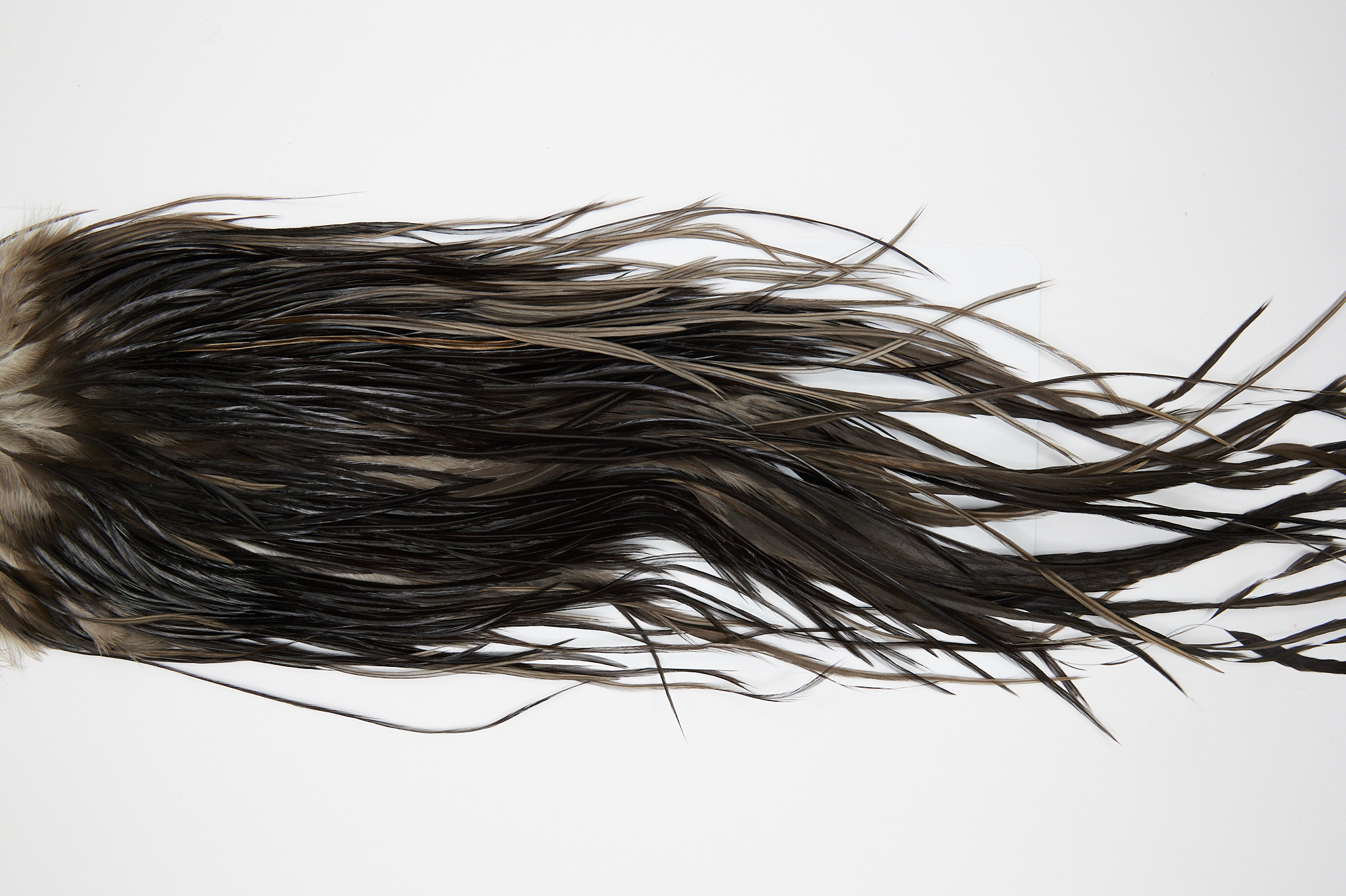 10526 is a JimsFlyCo Grade 3 Rooster Saddle of Black color that ties predominately size 10. The image shown is an actual photo of this dry fly saddle. This is NEW UNUSED HACKLE.