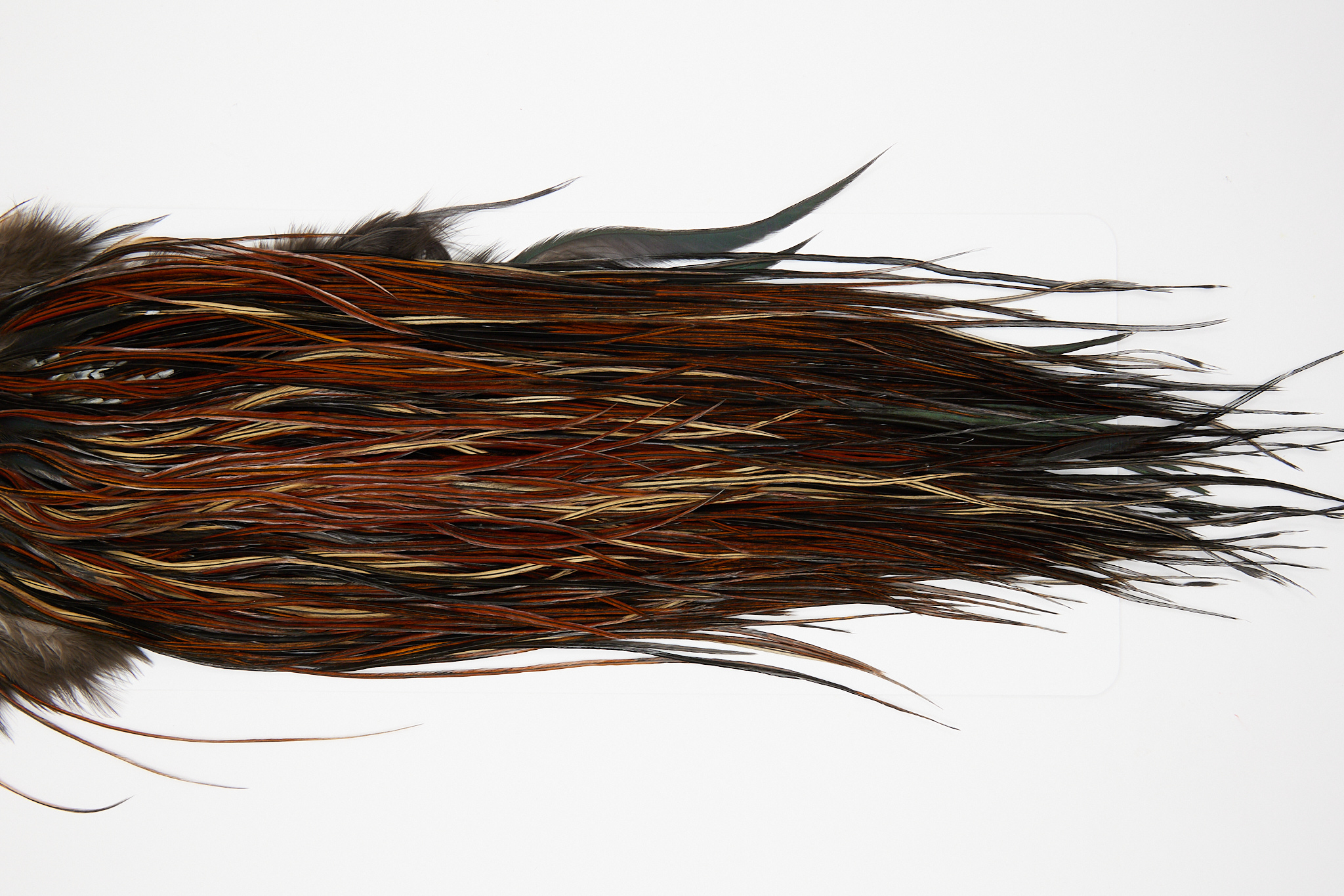 10562 is a JimsFlyCo Grade 2 Rooster Saddle of Furnace color that ties predominately size 14-16. The image shown is an actual photo of this dry fly saddle. This is NEW UNUSED HACKLE.