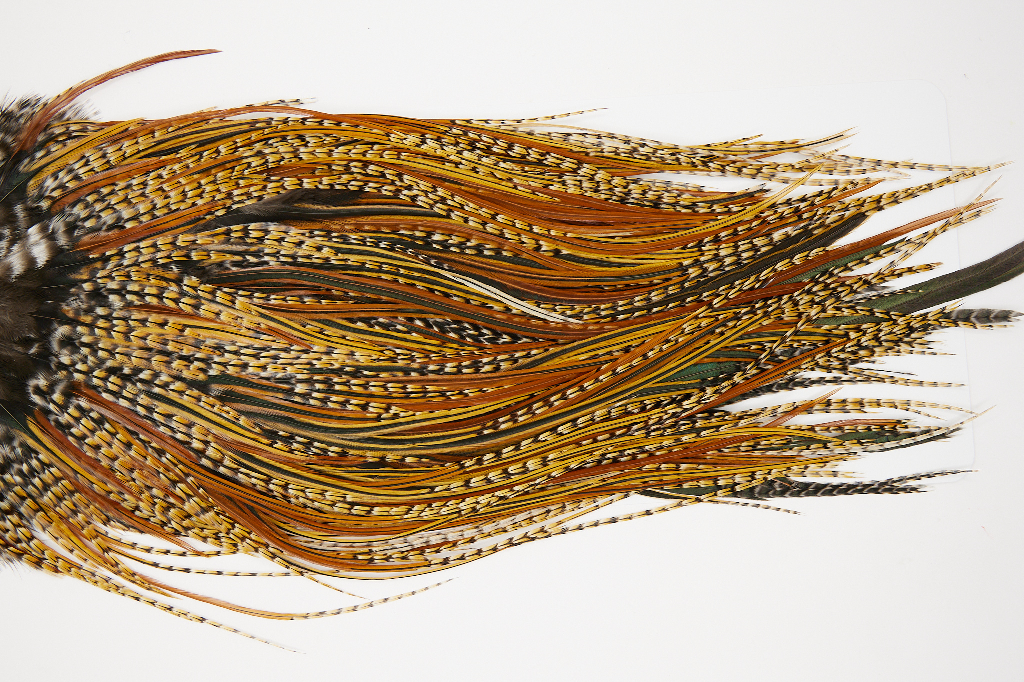 10581 is a JimsFlyCo Grade 2 Rooster Saddle of Cree Variant color that ties predominately size 14. The image shown is an actual photo of this dry fly saddle. This is NEW UNUSED HACKLE.