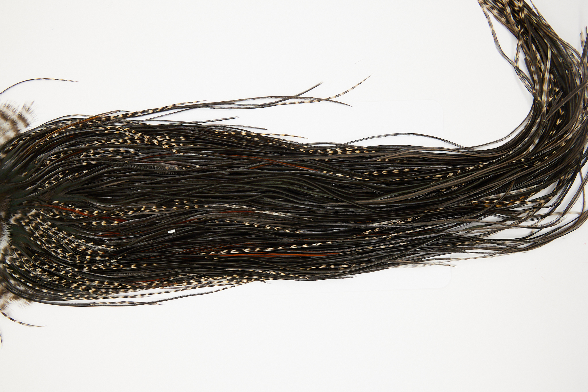 10599 is a JimsFlyCo Grade 1 Rooster Saddle of Variant color that ties predominately size 14-18. The image shown is an actual photo of this dry fly saddle. This is NEW UNUSED HACKLE.