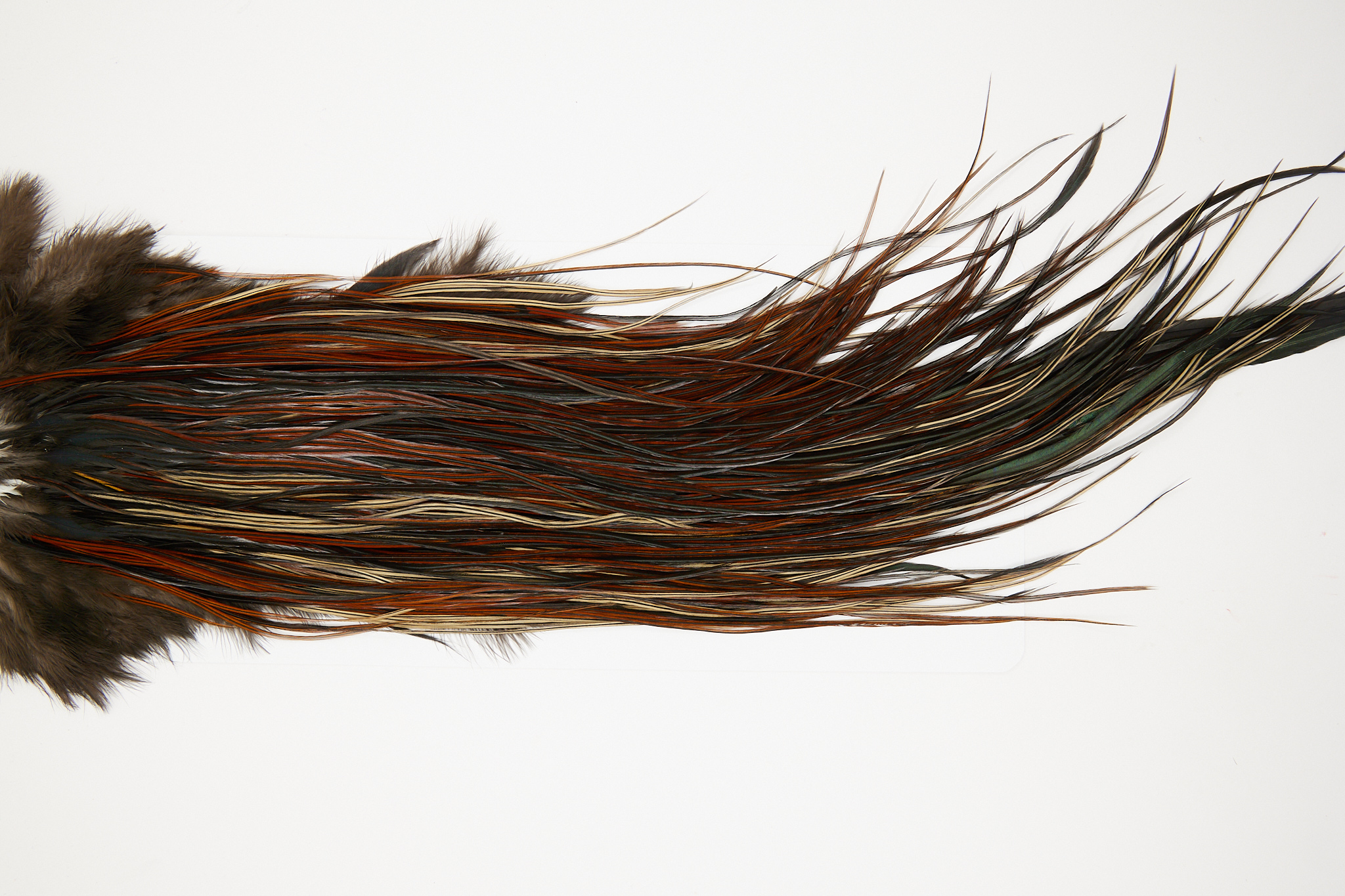 10633 is a JimsFlyCo Grade 1 Rooster Saddle of Furnace color that ties predominately size 14-16. The image shown is an actual photo of this dry fly saddle. This is NEW UNUSED HACKLE.
