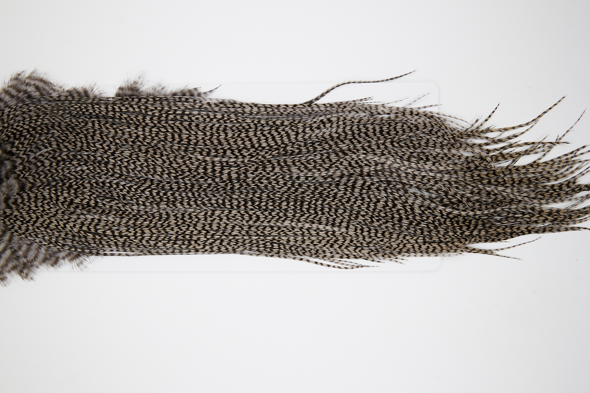 10664 is a Whiting Silver Grade Rooster Saddle of Grizzly Medium Dun color that ties predominately size 12-14. The image shown is an actual photo of this dry fly saddle. This is NEW UNUSED HACKLE.