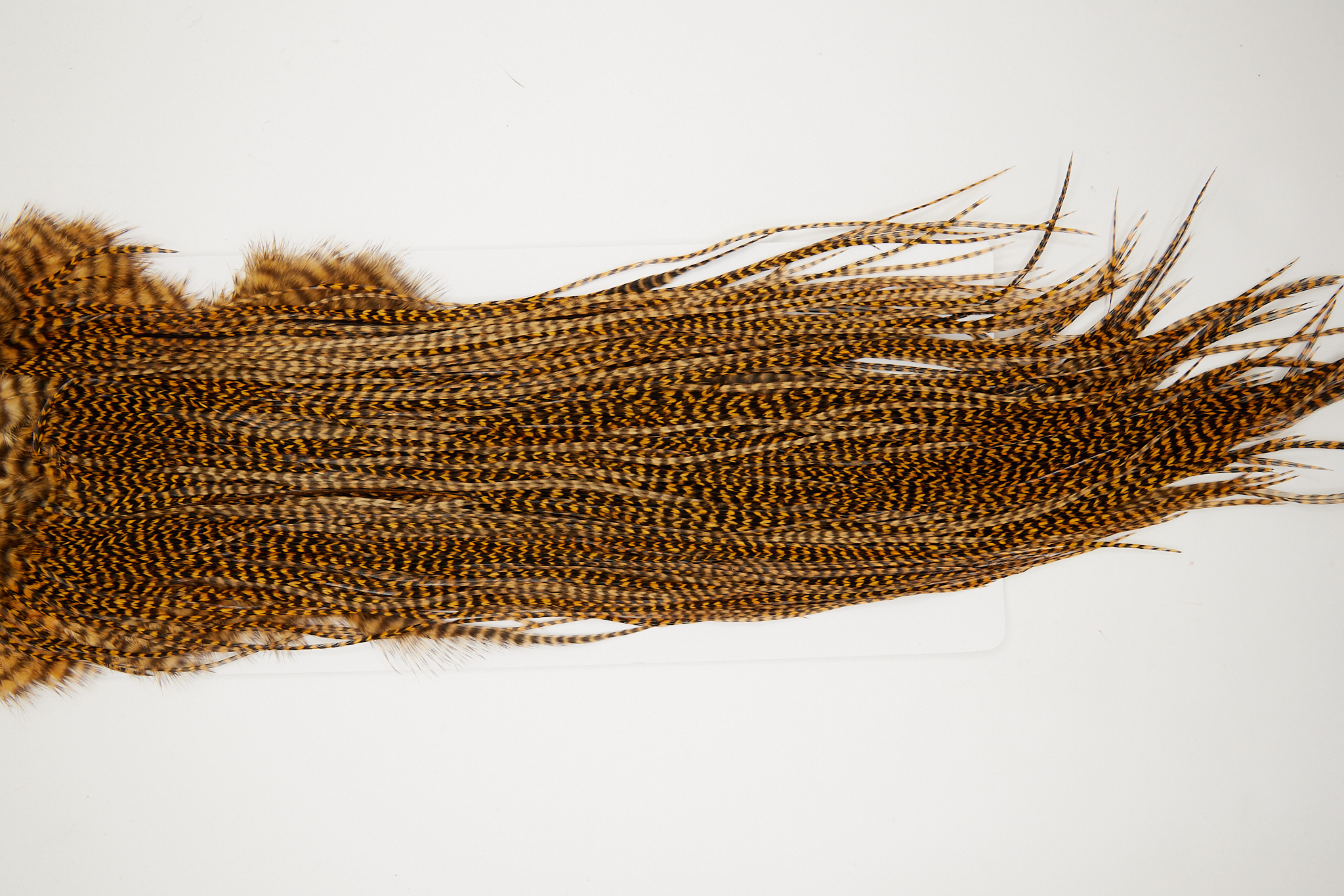 10692 is a Whiting Silver Grade Rooster Saddle of Grizzly Golden Brown color that ties predominately size 14-16. The image shown is an actual photo of this dry fly saddle. This is NEW UNUSED HACKLE.
