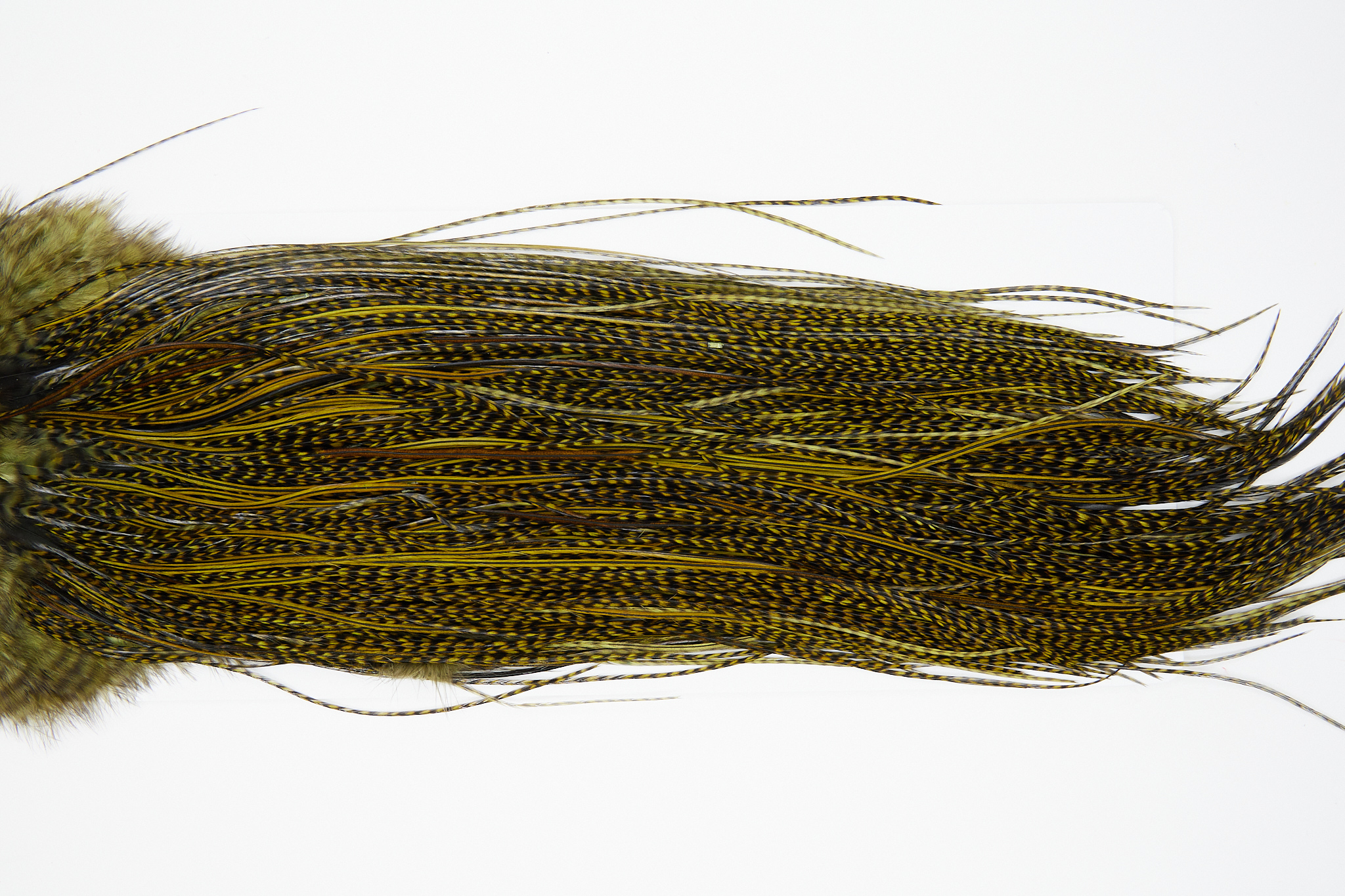 10716 is a Whiting Bronze Grade Rooster Saddle of Grizzly Dark Olive color that ties predominately size 14-16. The image shown is an actual photo of this dry fly saddle. This is NEW UNUSED HACKLE.