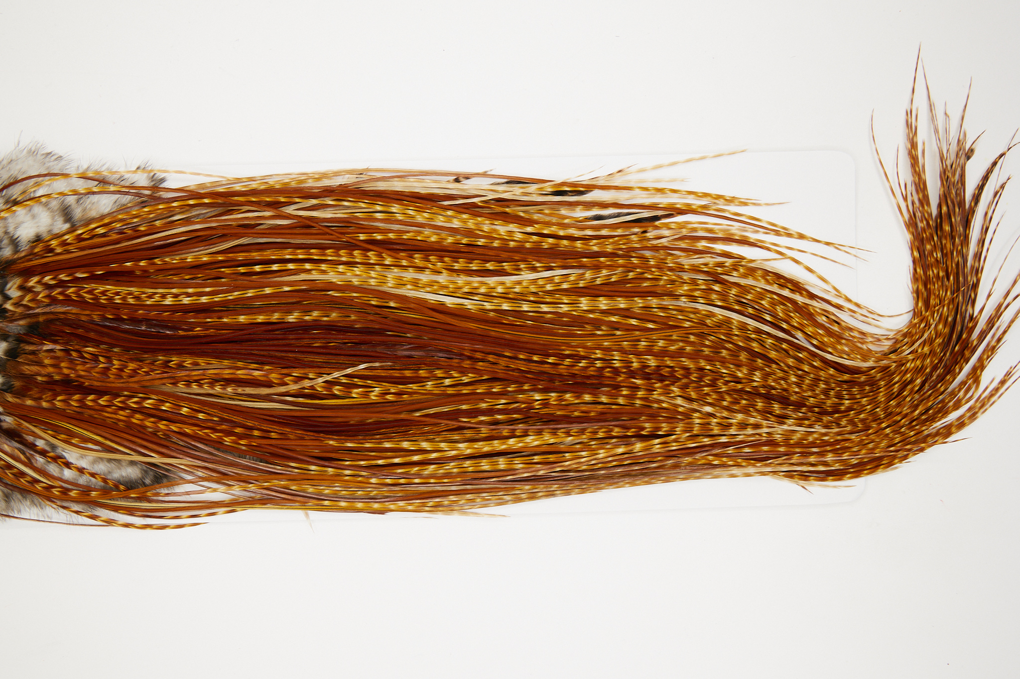 10746 is a Whiting Bronze Grade Rooster Saddle of Dark Barred Ginger color that ties predominately size 14-16. The image shown is an actual photo of this dry fly saddle. This is NEW UNUSED HACKLE.
