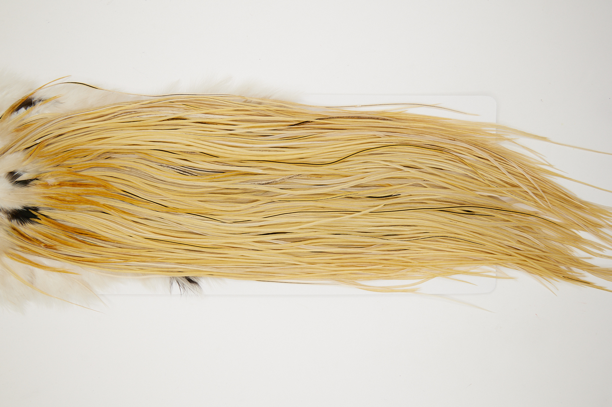 10751 is a Whiting Bronze Grade Rooster Saddle of Light Ginger color that ties predominately size 14-18. The image shown is an actual photo of this dry fly saddle. This is NEW UNUSED HACKLE.