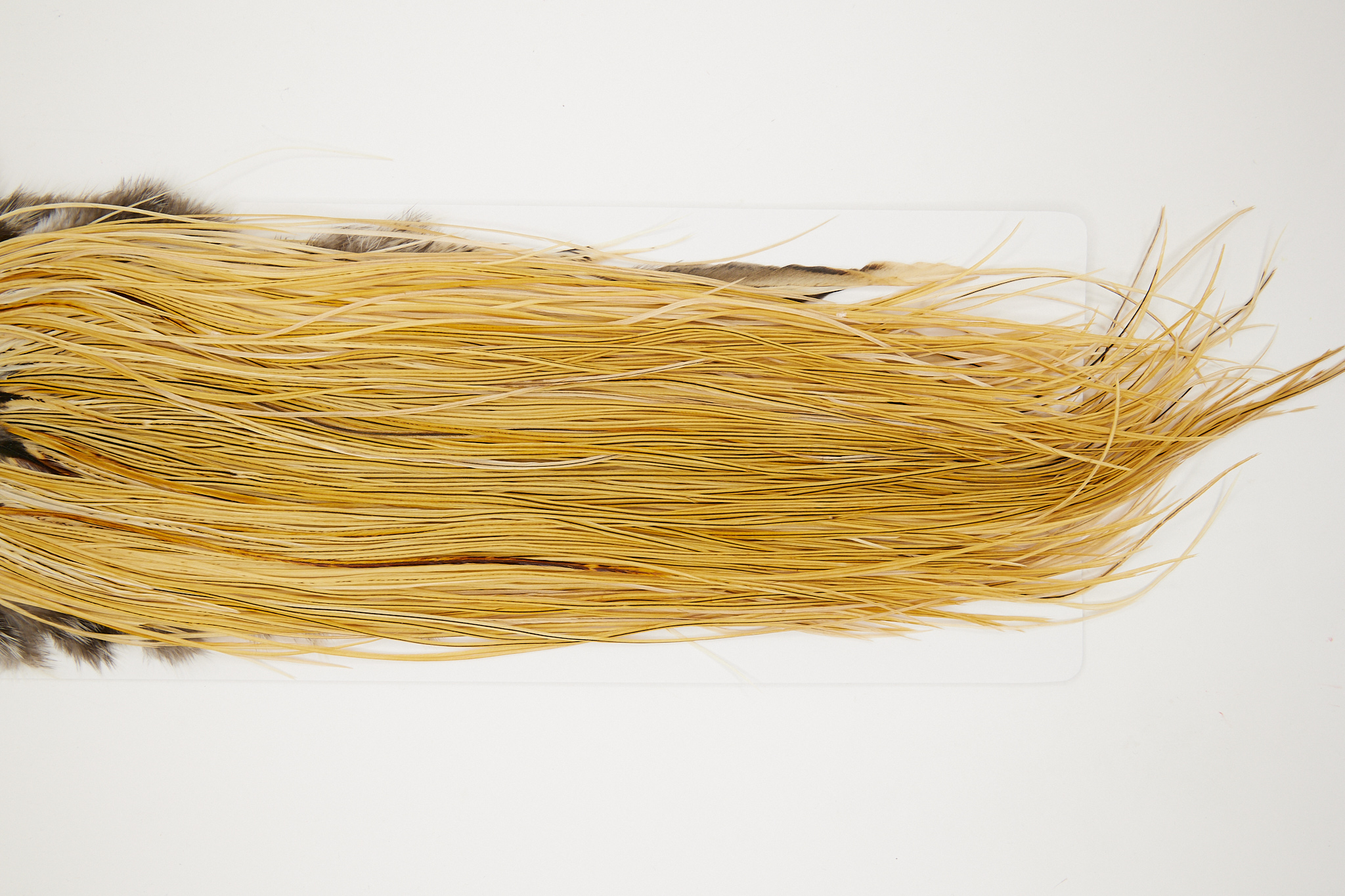 10752 is a Whiting Bronze Grade Rooster Saddle of Light Ginger color that ties predominately size 14-18. The image shown is an actual photo of this dry fly saddle. This is NEW UNUSED HACKLE.