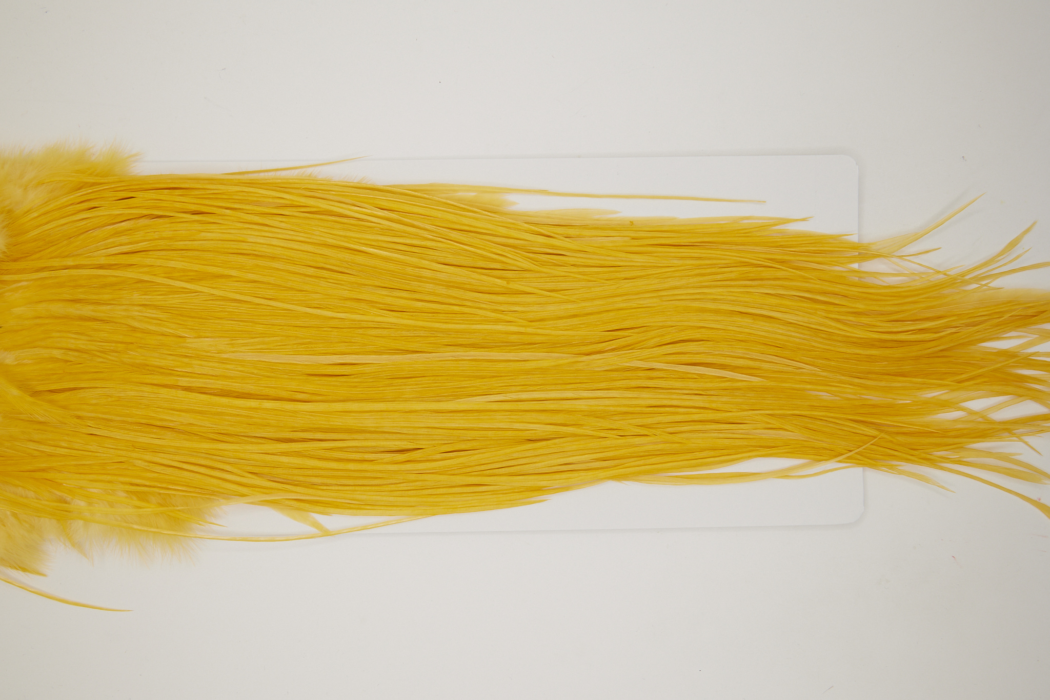 10753 is a Whiting Bronze Grade Rooster Saddle of Golden Straw color that ties predominately size 14. The image shown is an actual photo of this dry fly saddle. This is NEW UNUSED HACKLE.