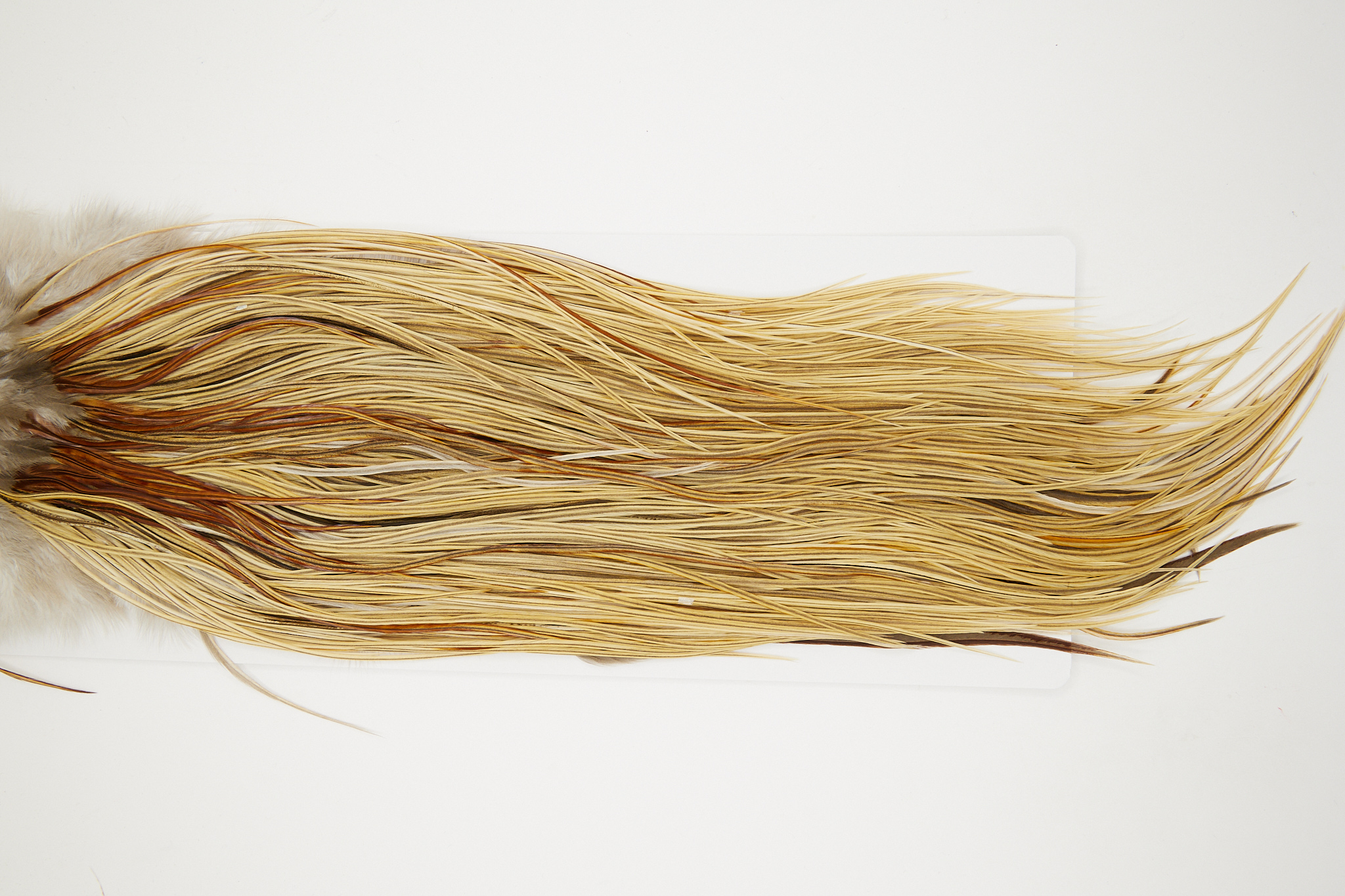 10853 is a Hebert Minor Bronze Grade Rooster Saddle of Light Ginger Dun color that ties predominately size 14-16. The image shown is an actual photo of this dry fly saddle. This is NEW UNUSED HACKLE.