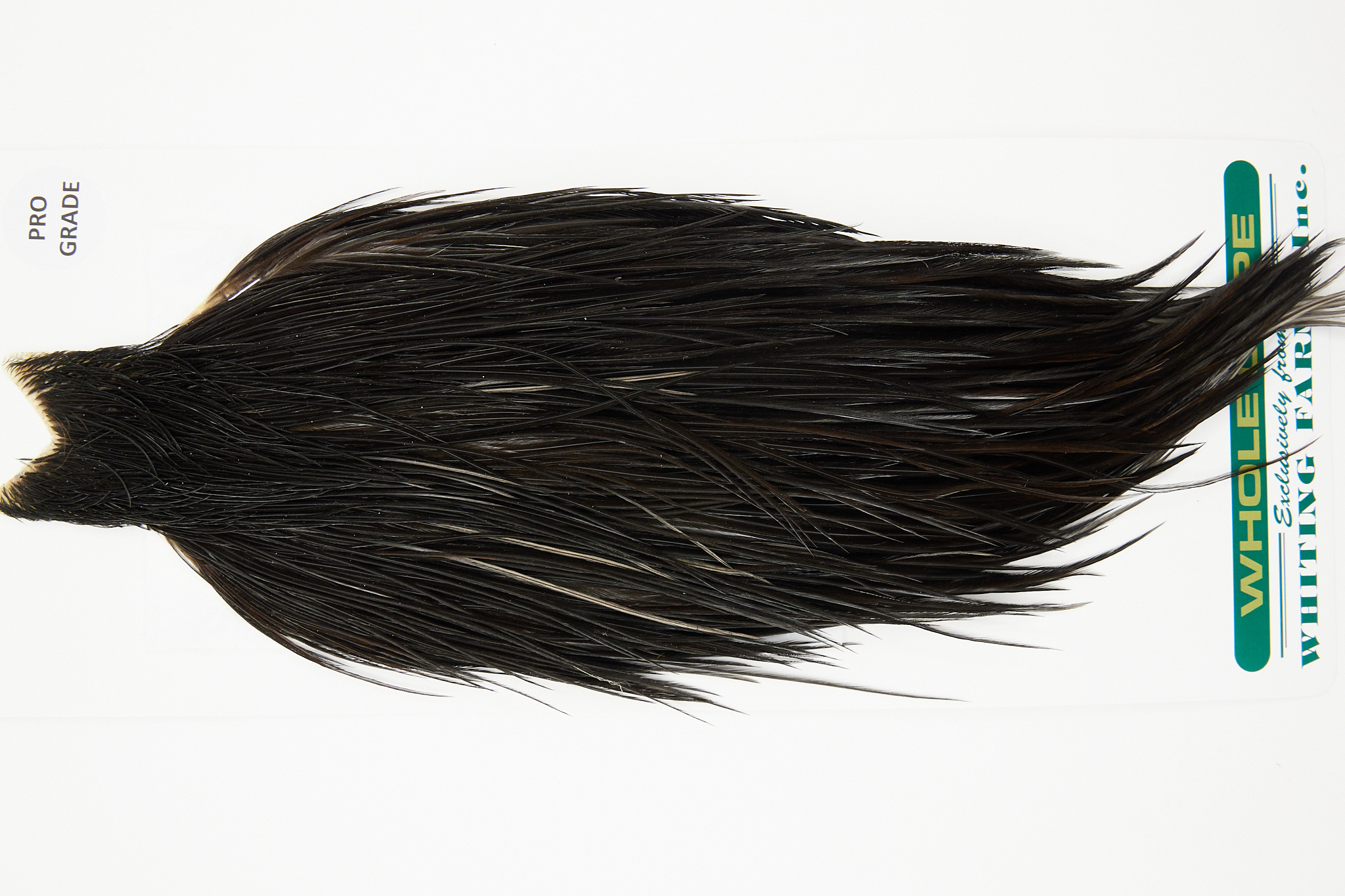 10966 is a Hebert Minor Pro Grade Rooster Cape of Black color that ties predominately size 10-20. The image shown is an actual photo of this dry fly cape. This is NEW UNUSED HACKLE.