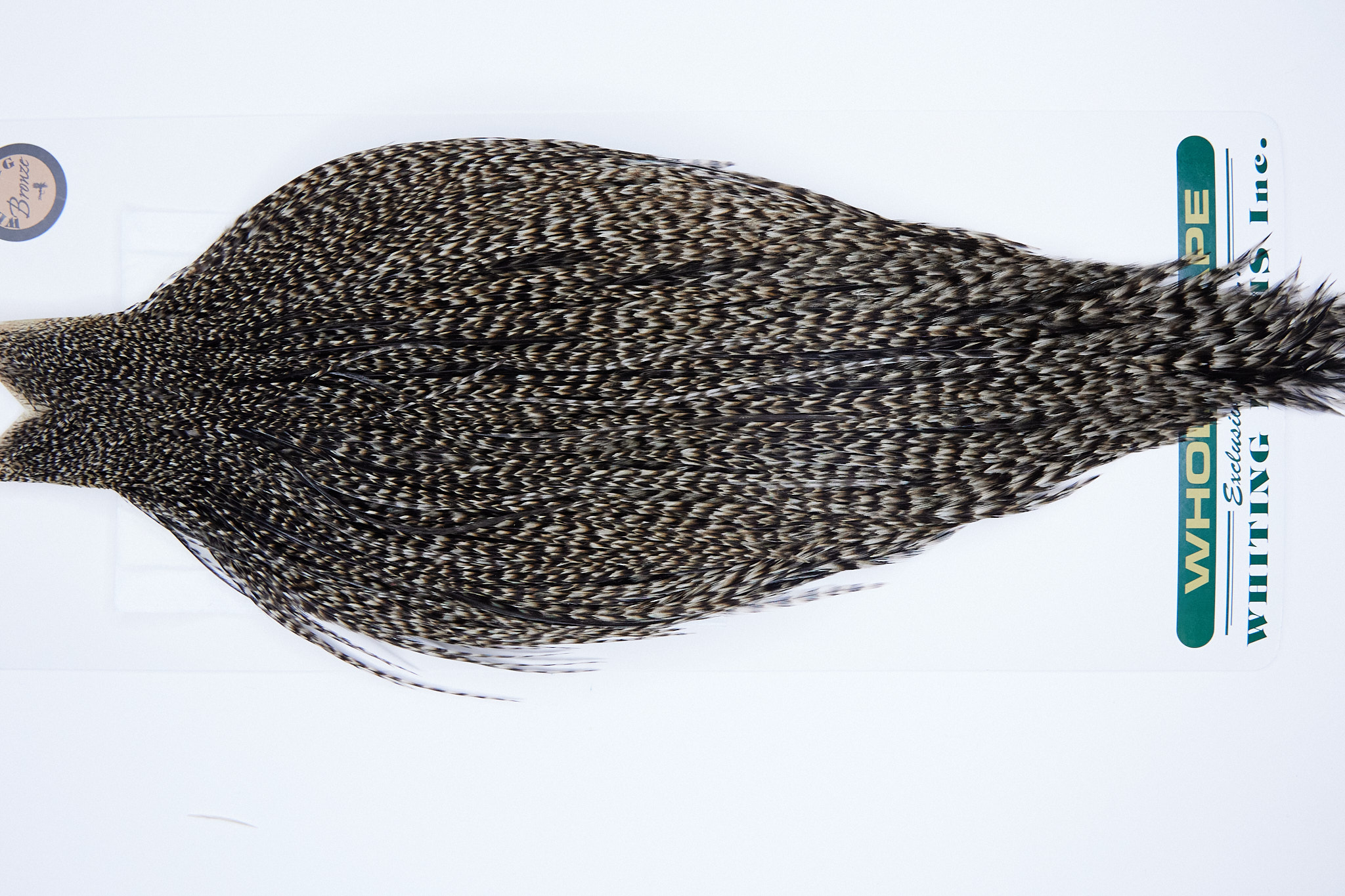1097 Heber Miner Bronze Grade Rooster Cape of a Grizzly Variant color. This dry fly hackle ties predominately sizes 12-22. The photo shown is an actual photo of this hackle.