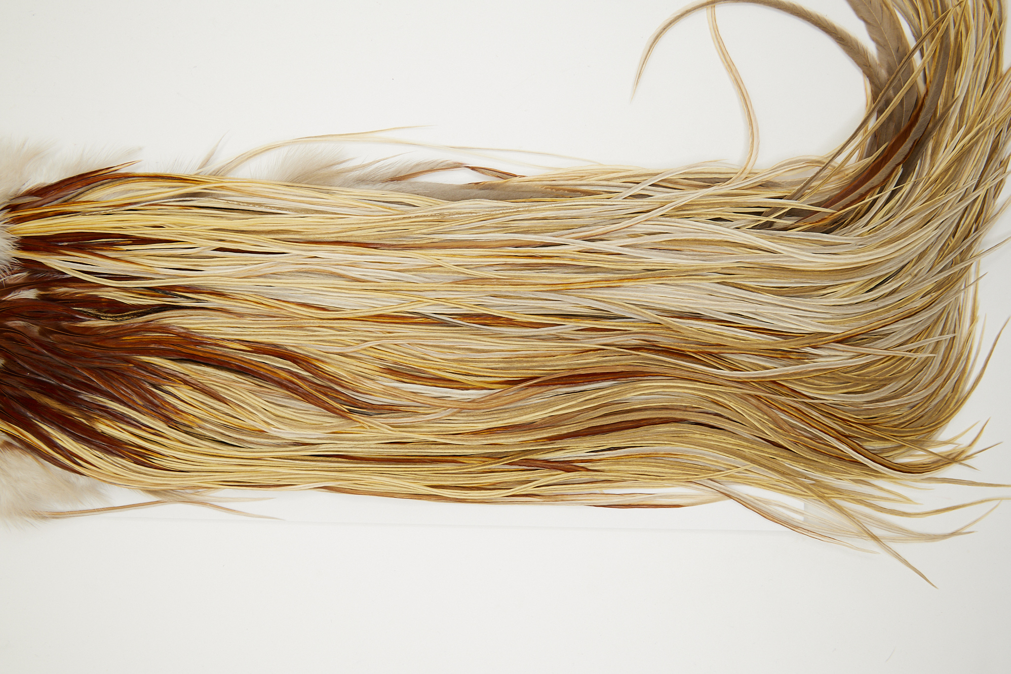 11069 is a Hebert Minor Gold Grade Rooster Saddle of Light Ginger Dun color that ties predominately size 12-18. The image shown is an actual photo of this dry fly saddle. This is NEW UNUSED HACKLE.