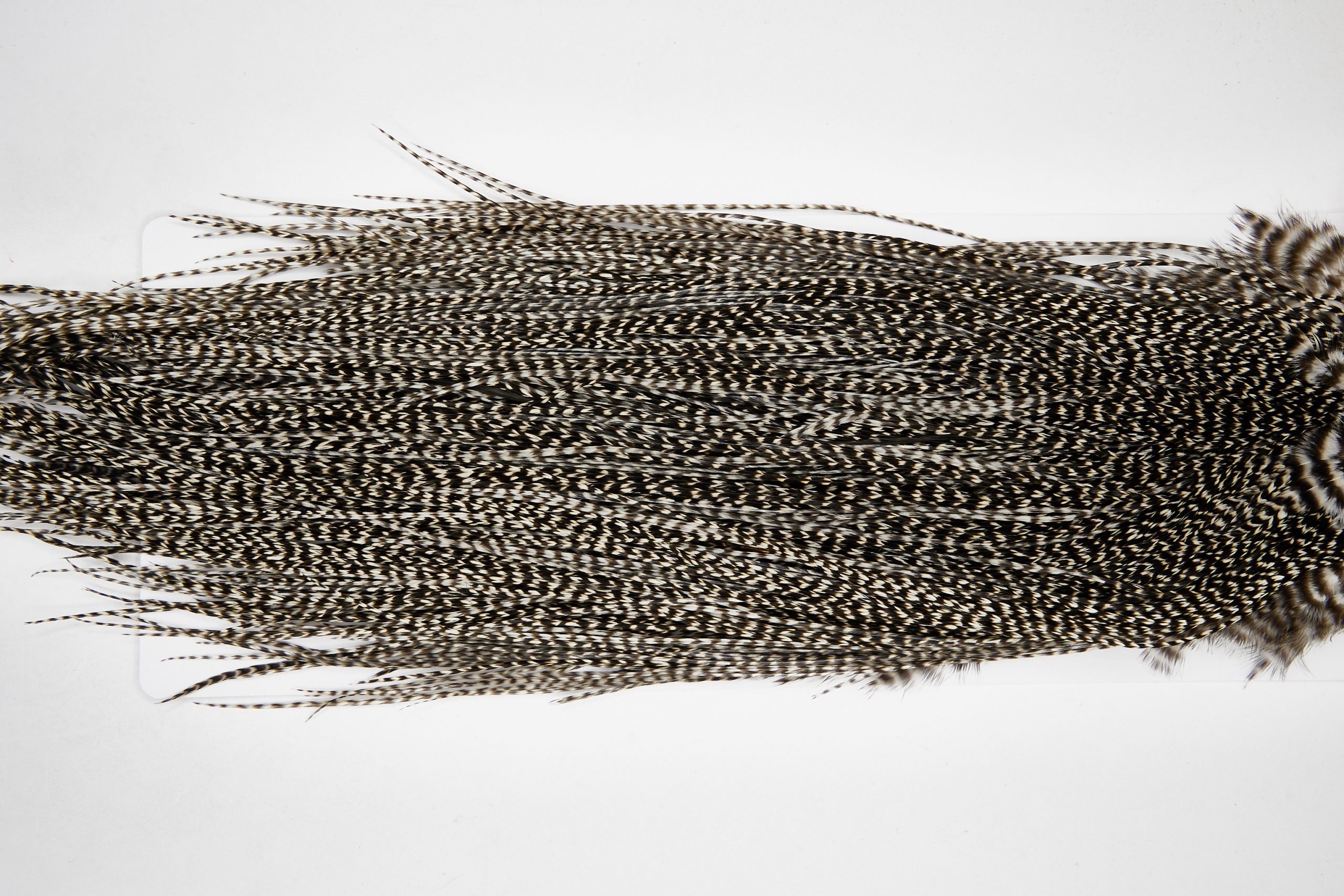 11126 is a Whiting Silver Grade Midge Saddle of Grizzly color that ties predominately size 18-20. The image shown is an actual photo of this wet fly saddle. This is NEW UNUSED HACKLE.