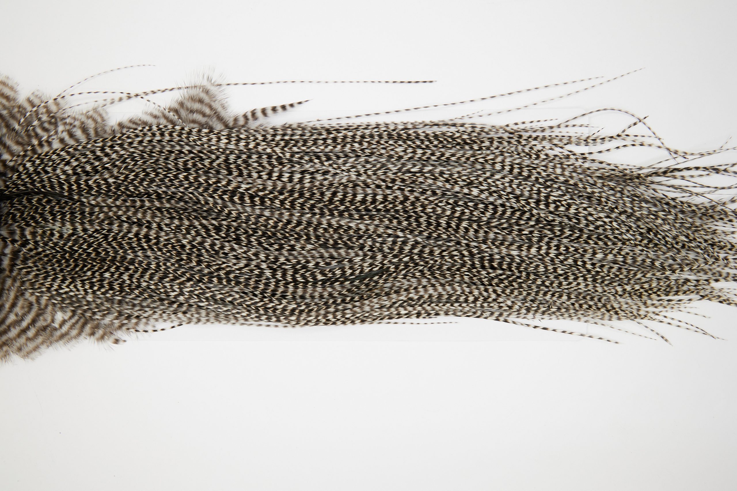 11171 is a Whiting Gold Grade Rooster Saddle of Grizzly color that ties predominately size 12-16. The image shown is an actual photo of this dry fly saddle. This is NEW UNUSED HACKLE.