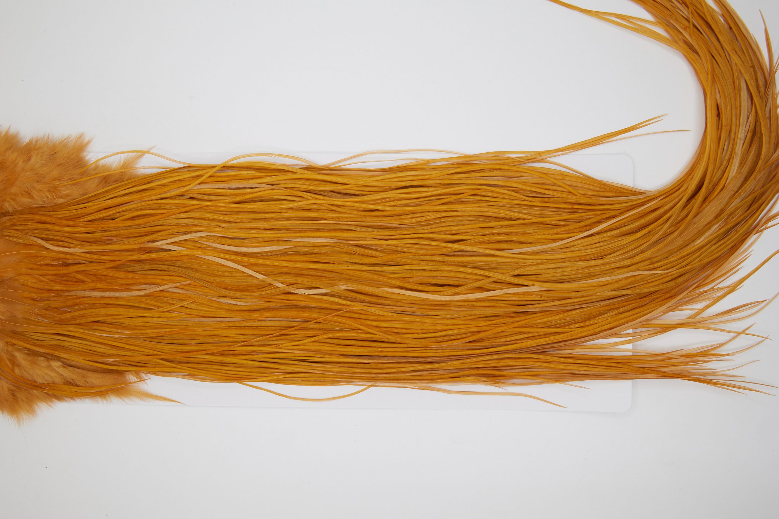 11176 is a Whiting Gold Grade Rooster Saddle of Golden Brown color that ties predominately size 12-16. The image shown is an actual photo of this dry fly saddle. This is NEW UNUSED HACKLE.