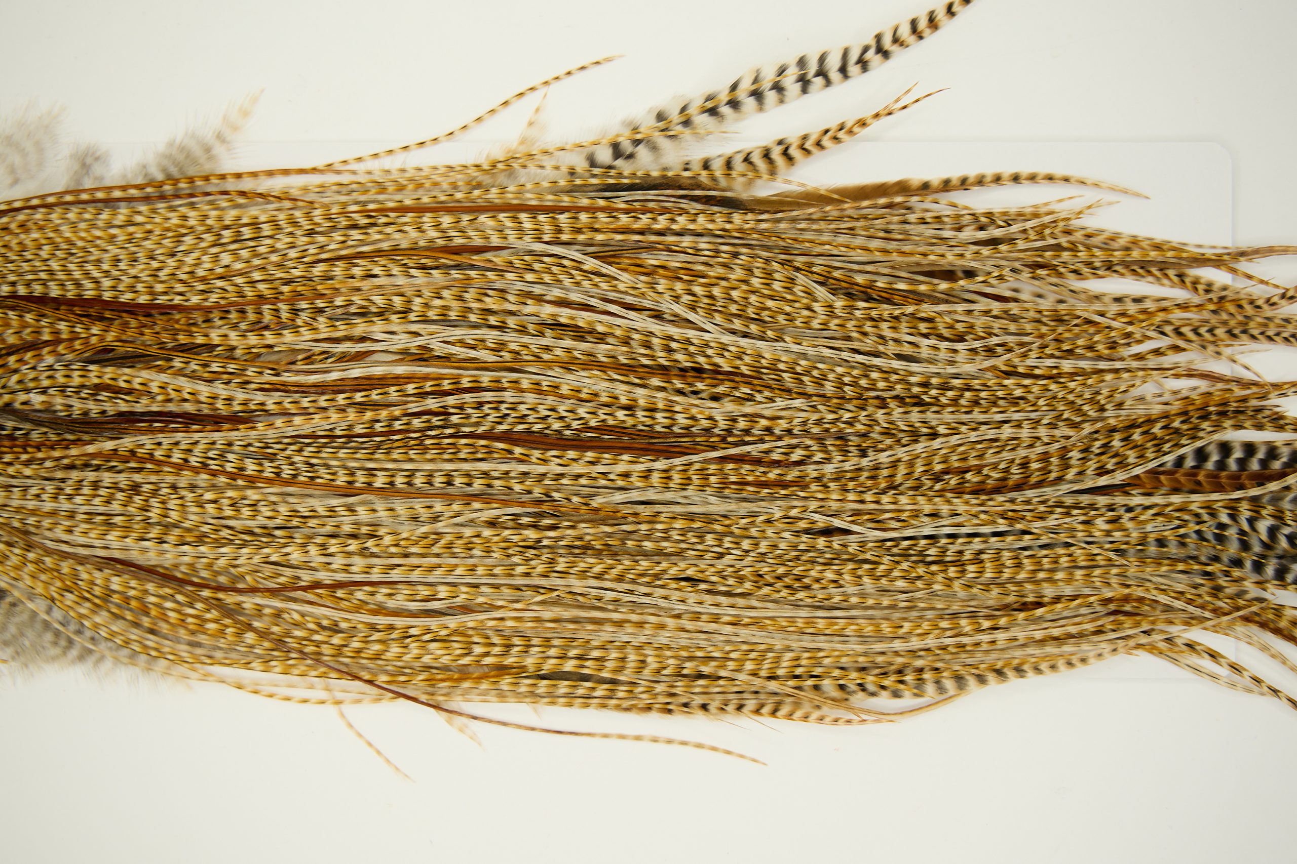 11243 is a Whiting Pro Grade Rooster Saddle of Barred Medium Ginger color that ties predominately size 16-18. The image shown is an actual photo of this dry fly saddle. This is NEW UNUSED HACKLE.