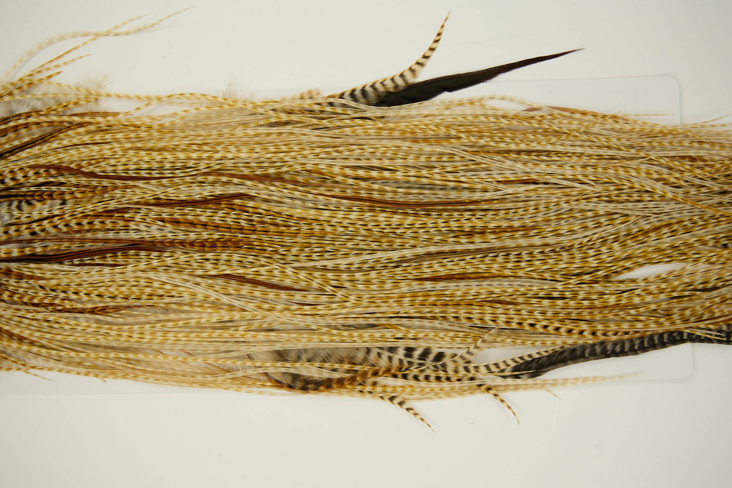 11244 is a Whiting Pro Grade Rooster Saddle of Barred Medium Ginger color that ties predominately size 16-18. The image shown is an actual photo of this dry fly saddle. This is NEW UNUSED HACKLE.