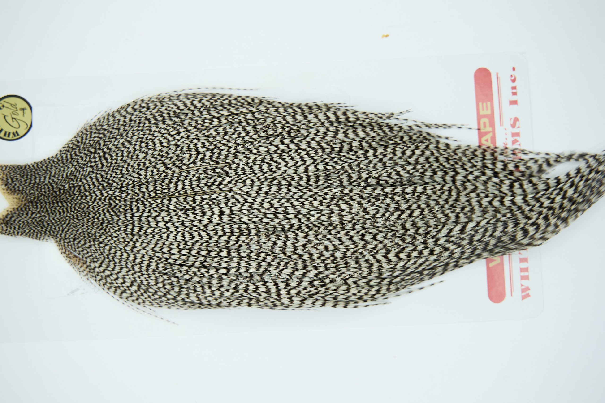11259Whiting Gold Grade Rooster Cape of Grizzly color that ties predominately size 10-24. The image shown is an actual photo of this dry fly cape. This is NEW UNUSED HACKLE.