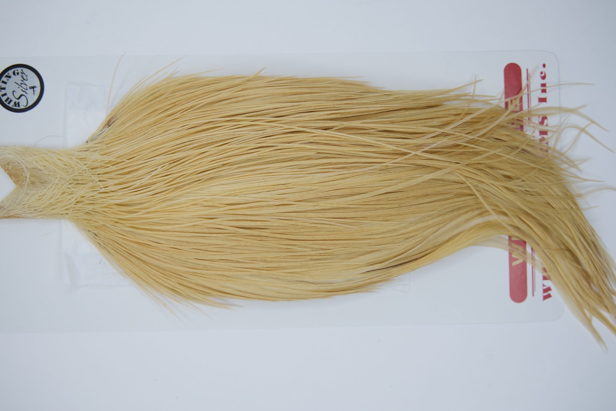 11293Whiting Silver Grade Rooster Cape of Light Ginger color that ties predominately size 8-26. The image shown is an actual photo of this dry fly cape. This is NEW UNUSED HACKLE.
