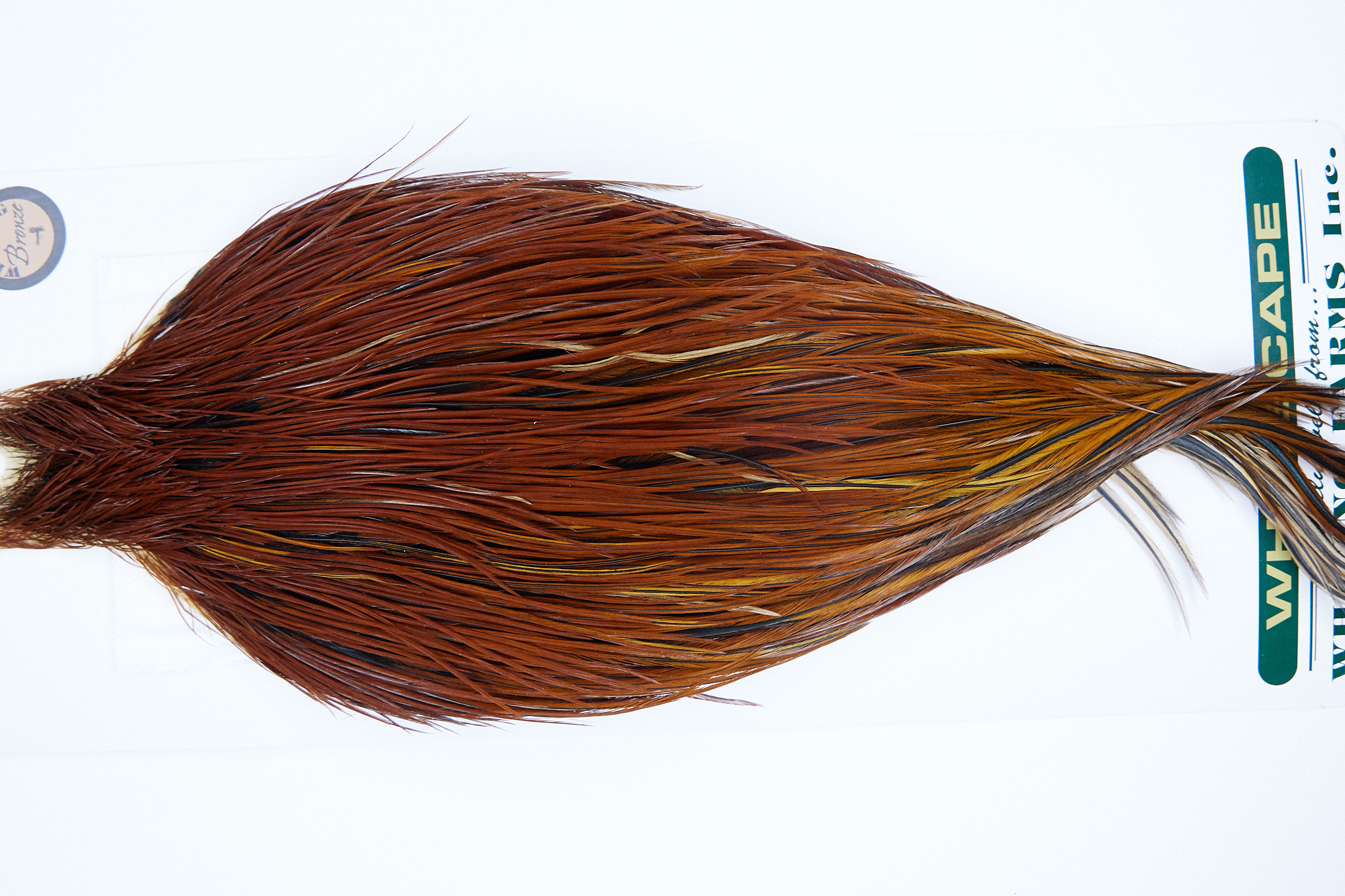 1132 Heber Miner Bronze Grade Rooster Cape of a Medium Brown color. This dry fly hackle ties predominately sizes 10-24. The photos shown are the actual photos of this dry fly Rooster Cape.