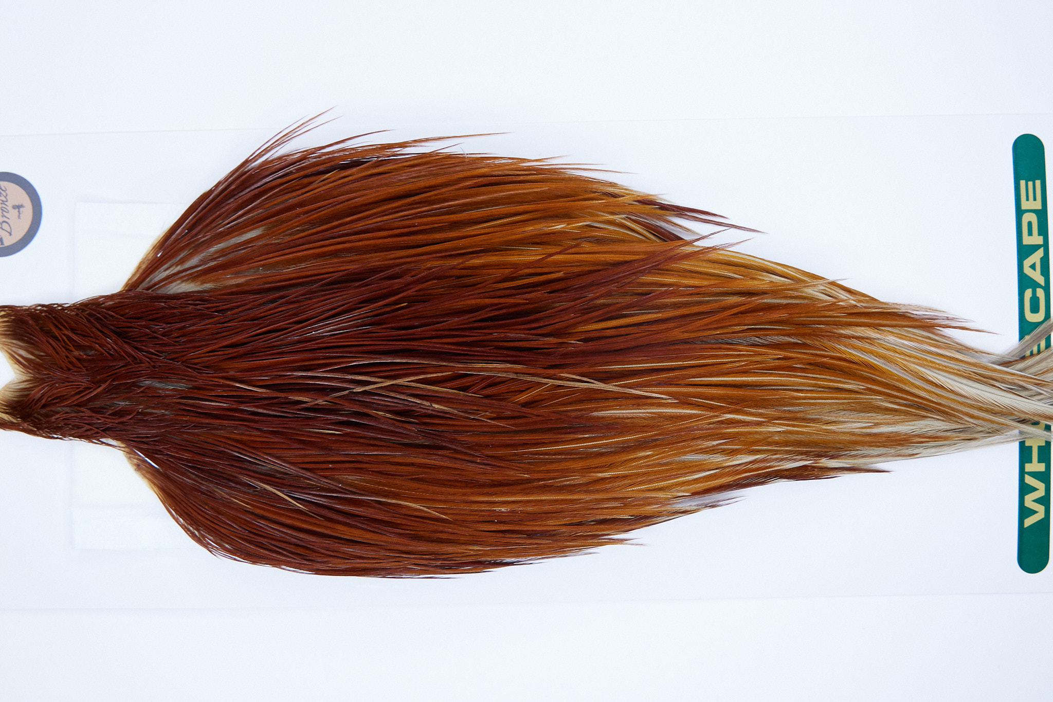 1140 Heber Miner Bronze Grade Rooster Cape of a Medium Brown color. This dry fly hackle ties predominately sizes 12-24. The photo shown is an actual photo of this hackle.
