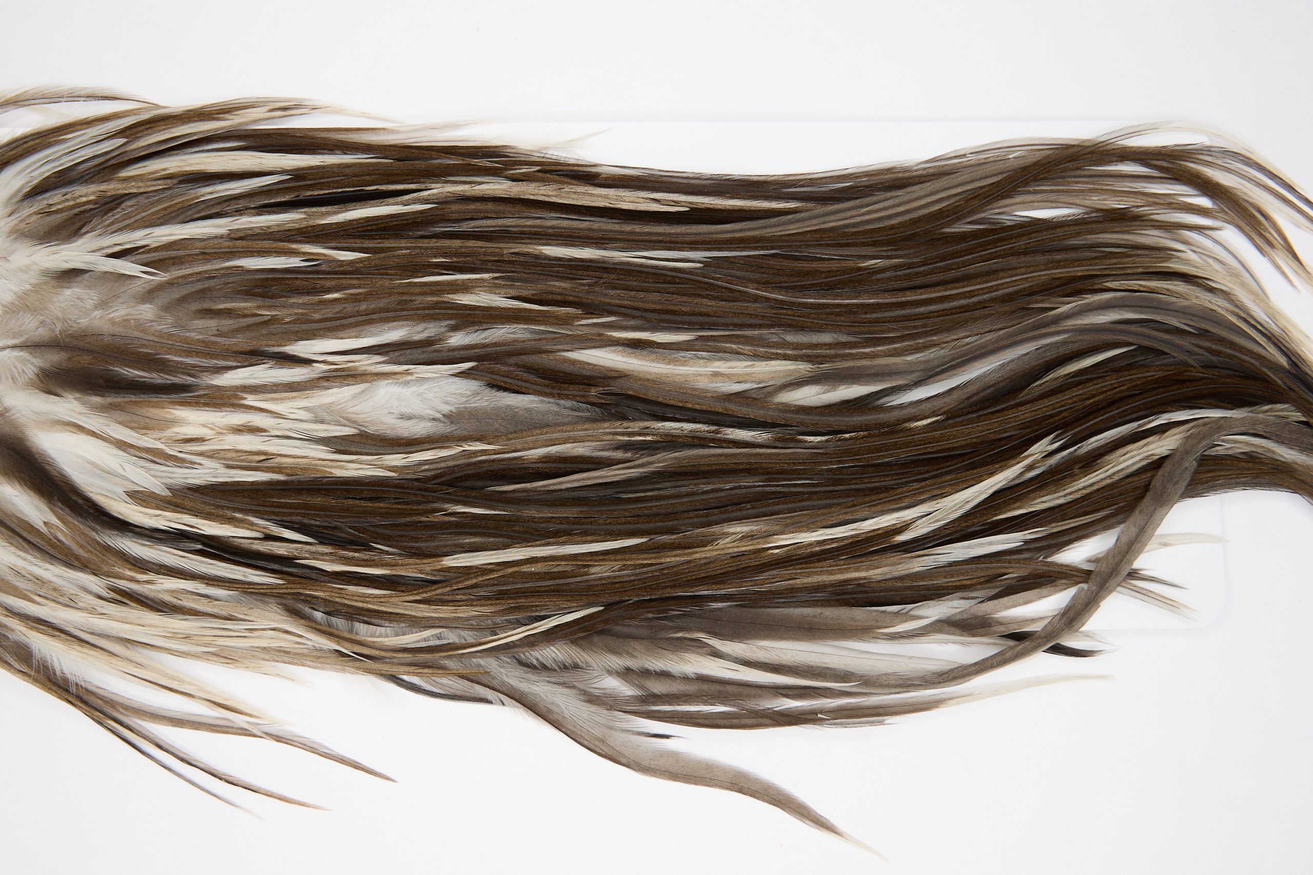 11425 is a JimsFlyCo Grade 2 Rooster Saddle of Dun Splash color that ties predominately size 12. The image shown is an actual photo of this dry fly saddle. This is NEW UNUSED HACKLE.