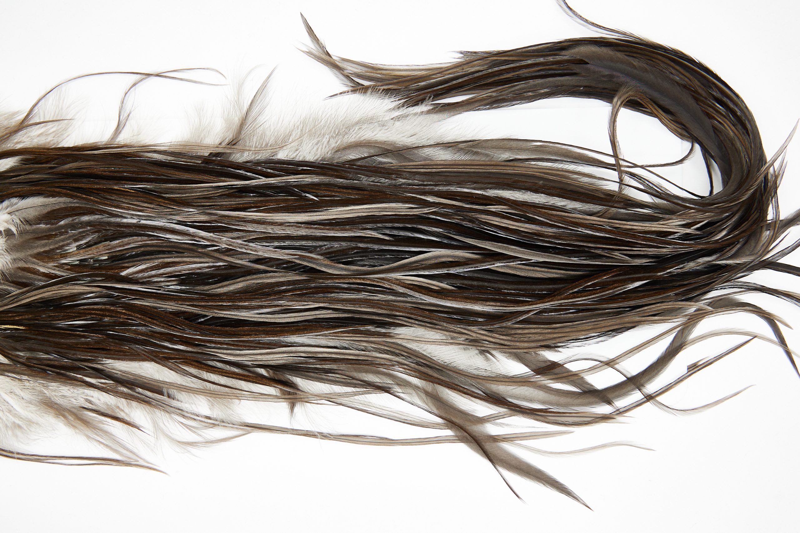 11432 is a JimsFlyCo Grade 3 Rooster Saddle of Variant color that ties predominately size 10-14. The image shown is an actual photo of this dry fly saddle. This is NEW UNUSED HACKLE.