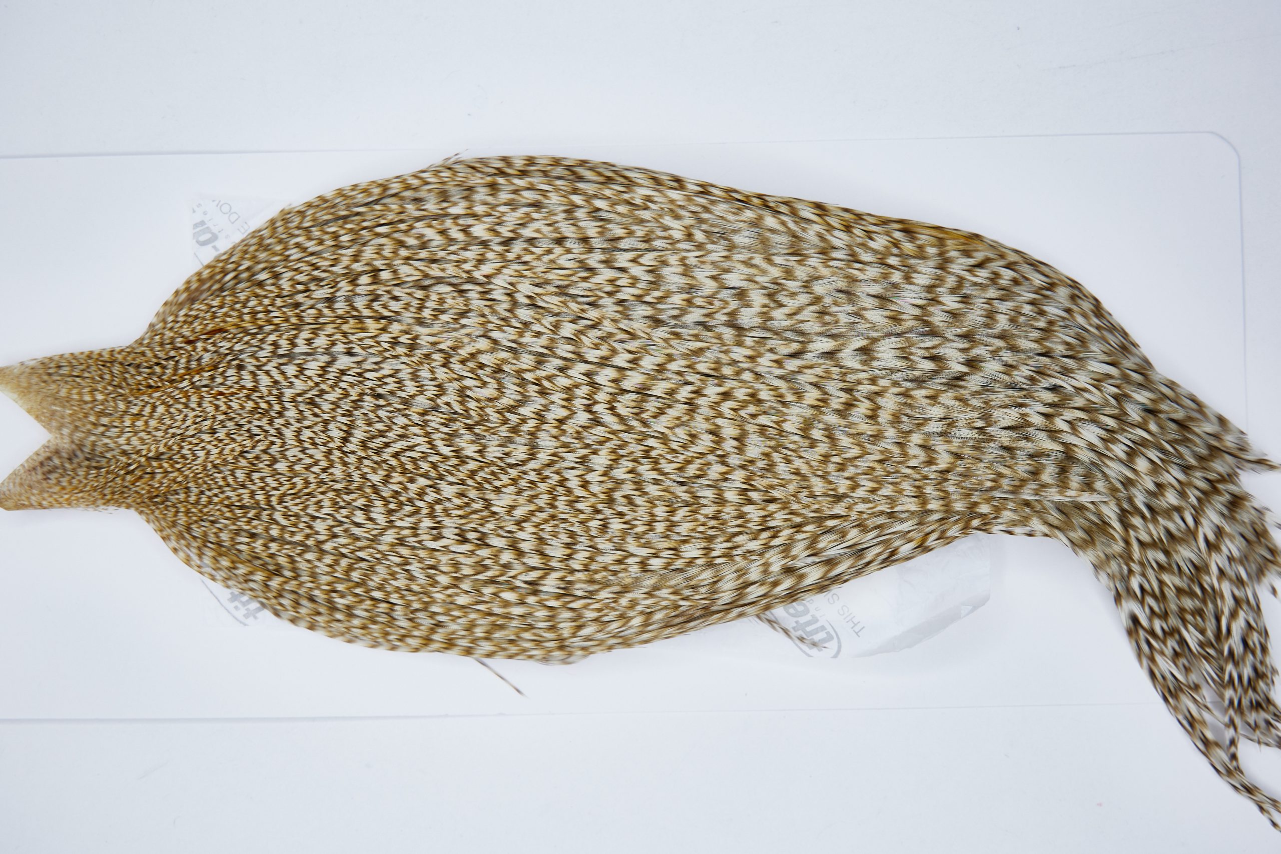 11589 is a Beaverkill Rooster Saddle of Variant color that ties predominately size 6-22. The image shown is an actual photo of this dry fly saddle. This is NEW UNUSED HACKLE.