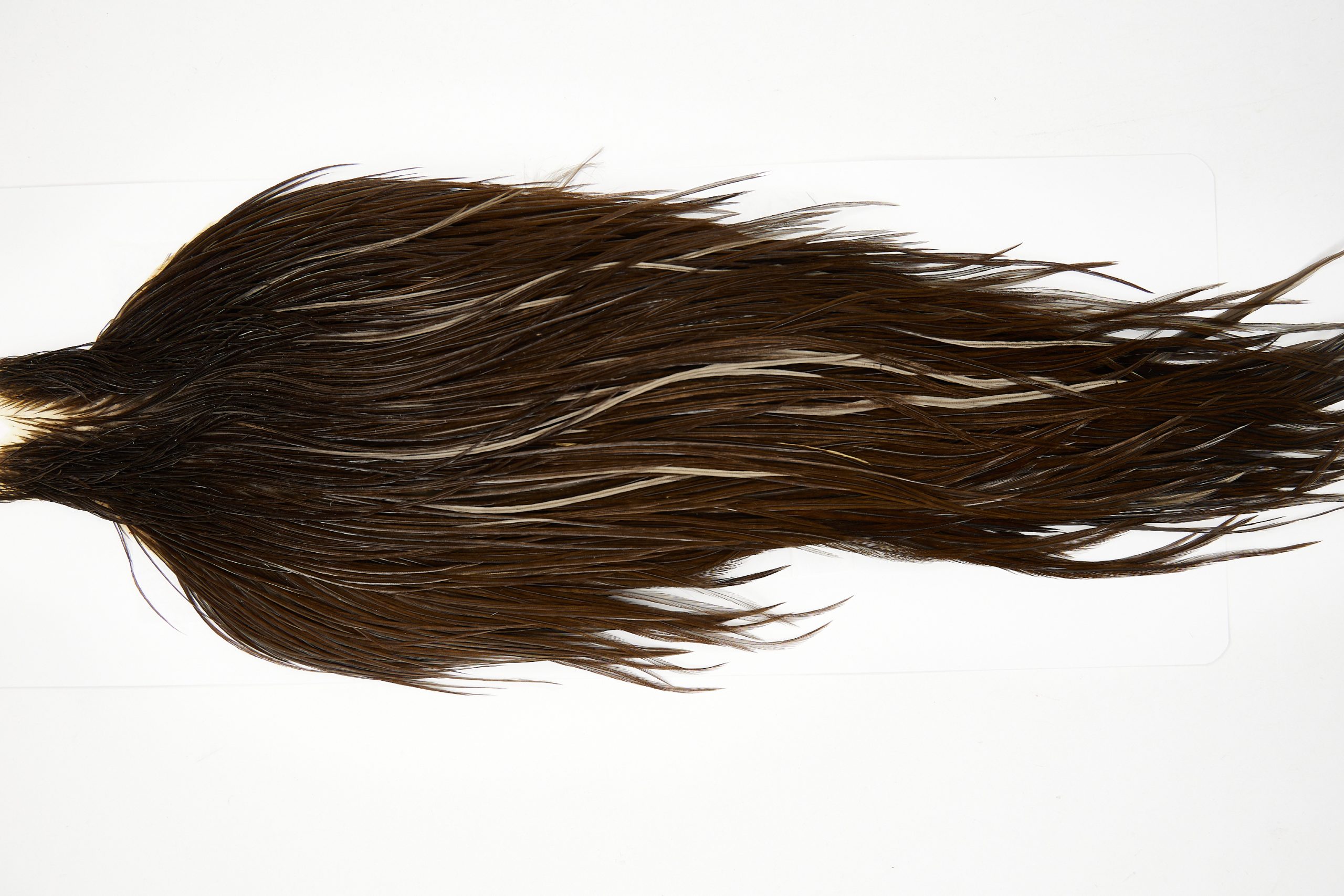 11592 is a Beaverkill Rooster Saddle of Dark Brown Dun color that ties predominately size 8-22. The image shown is an actual photo of this dry fly saddle. This is NEW UNUSED HACKLE.