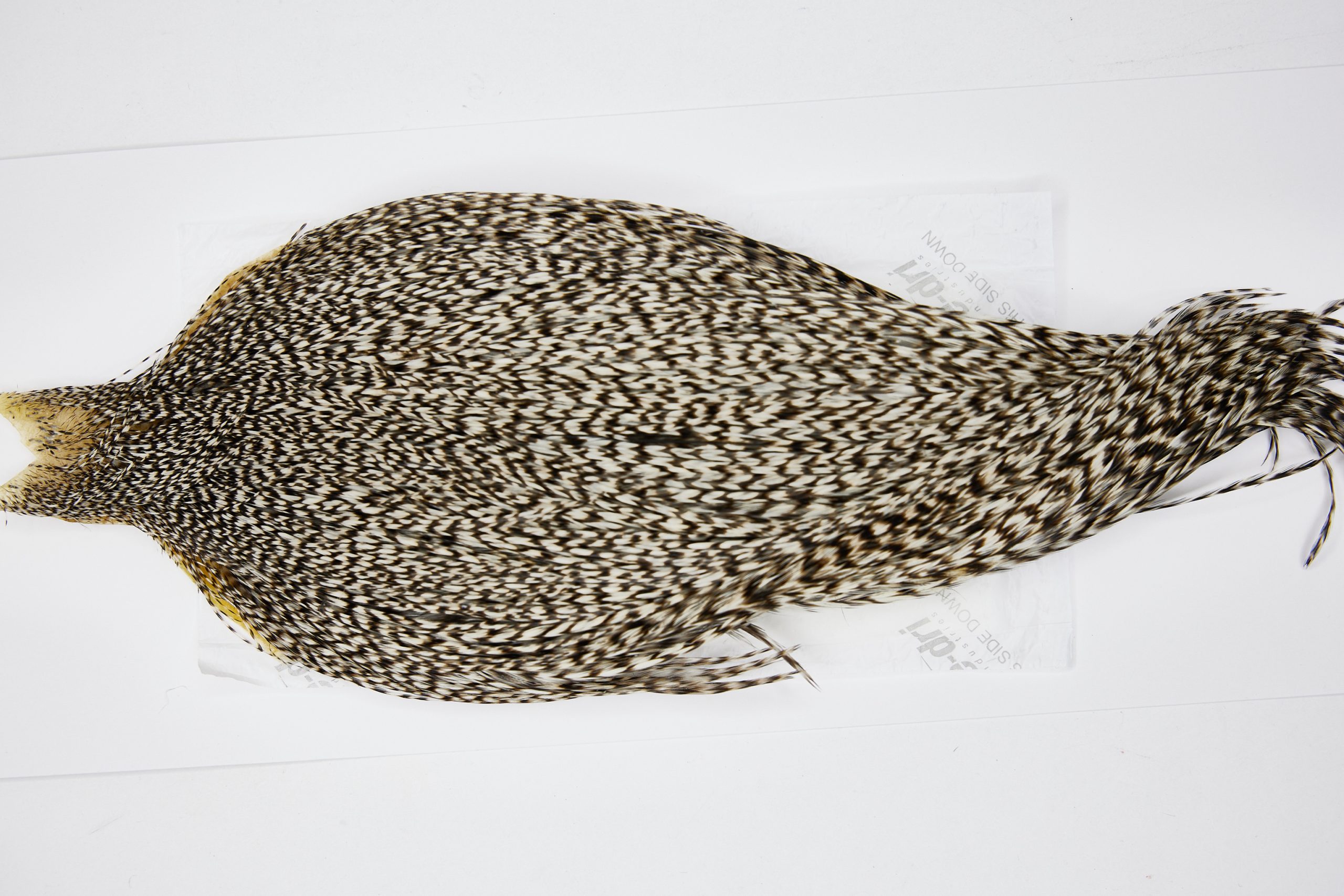 11604 is a Beaverkill Rooster Saddle of Grizzly color that ties predominately size 8-22. The image shown is an actual photo of this dry fly saddle. This is NEW UNUSED HACKLE.