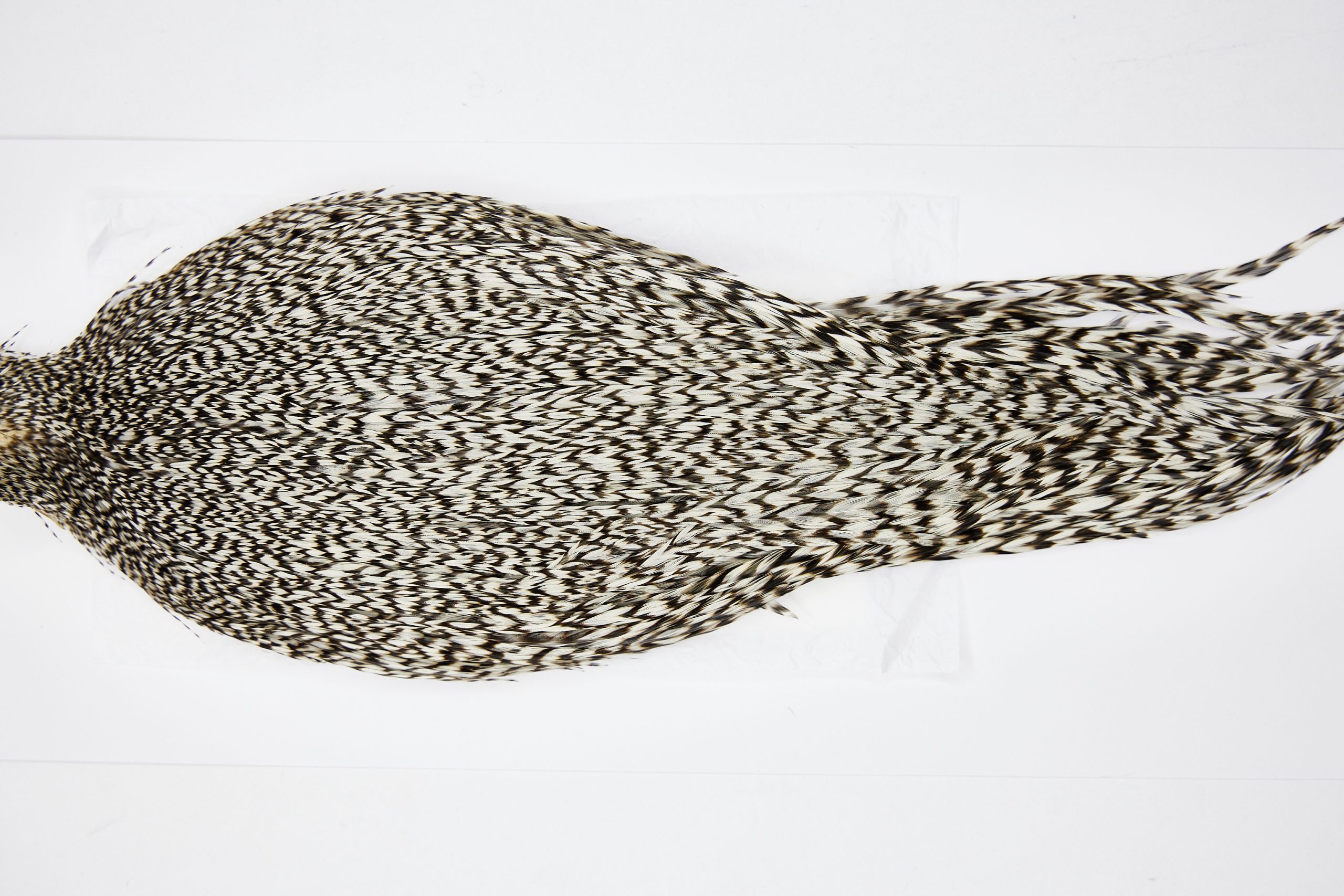 11608 is a Beaverkill Rooster Saddle of Grizzly color that ties predominately size 8-22. The image shown is an actual photo of this dry fly saddle. This is NEW UNUSED HACKLE.
