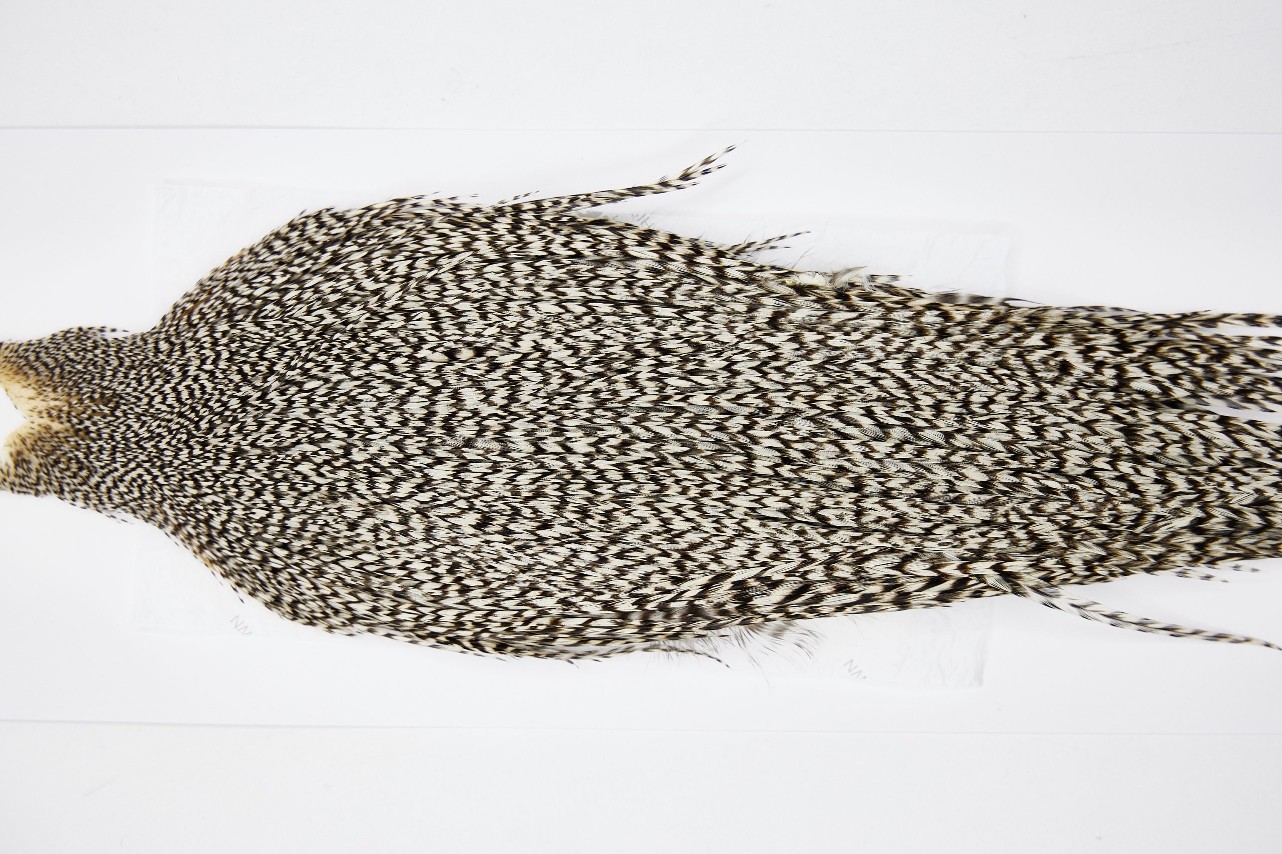 11609 is a Beaverkill Rooster Saddle of Grizzly color that ties predominately size 8-22. The image shown is an actual photo of this dry fly saddle. This is NEW UNUSED HACKLE.