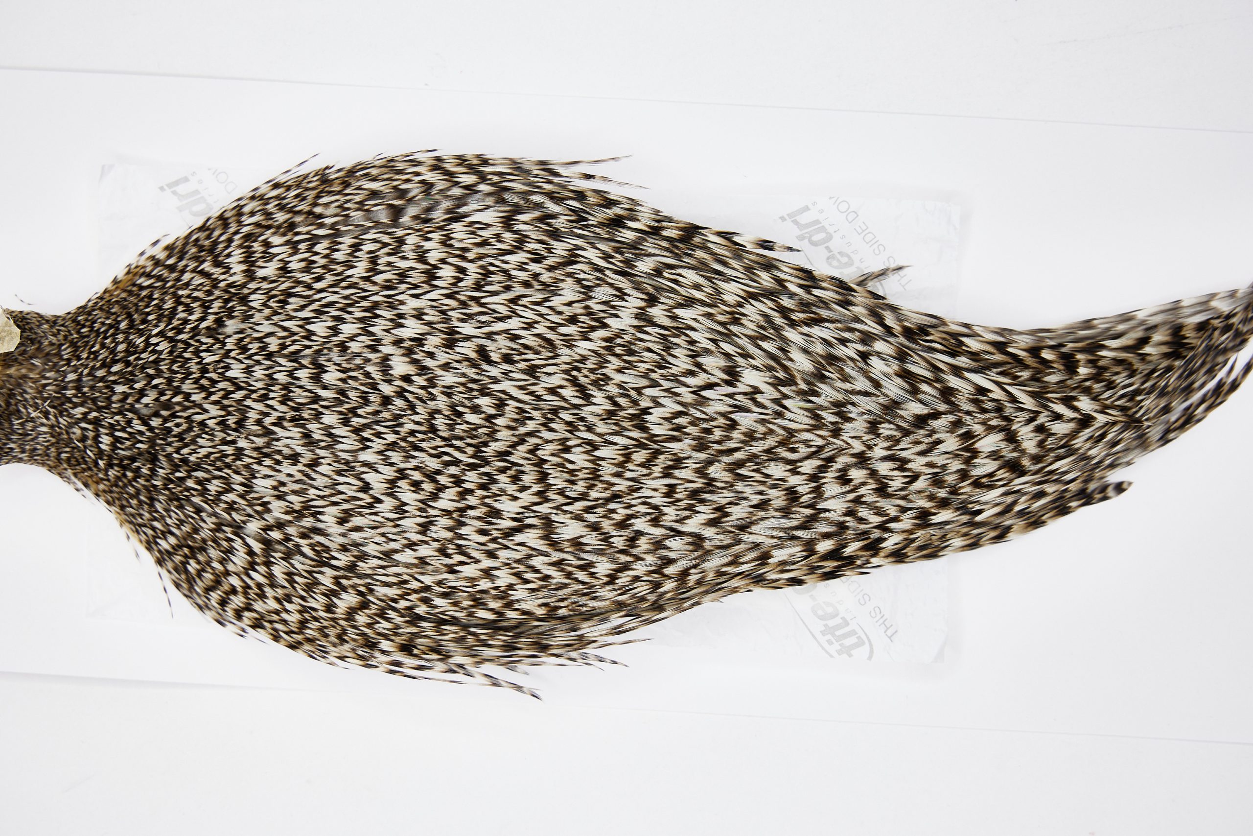 11610 is a Beaverkill Rooster Saddle of Grizzly color that ties predominately size 8-22. The image shown is an actual photo of this dry fly saddle. This is NEW UNUSED HACKLE.